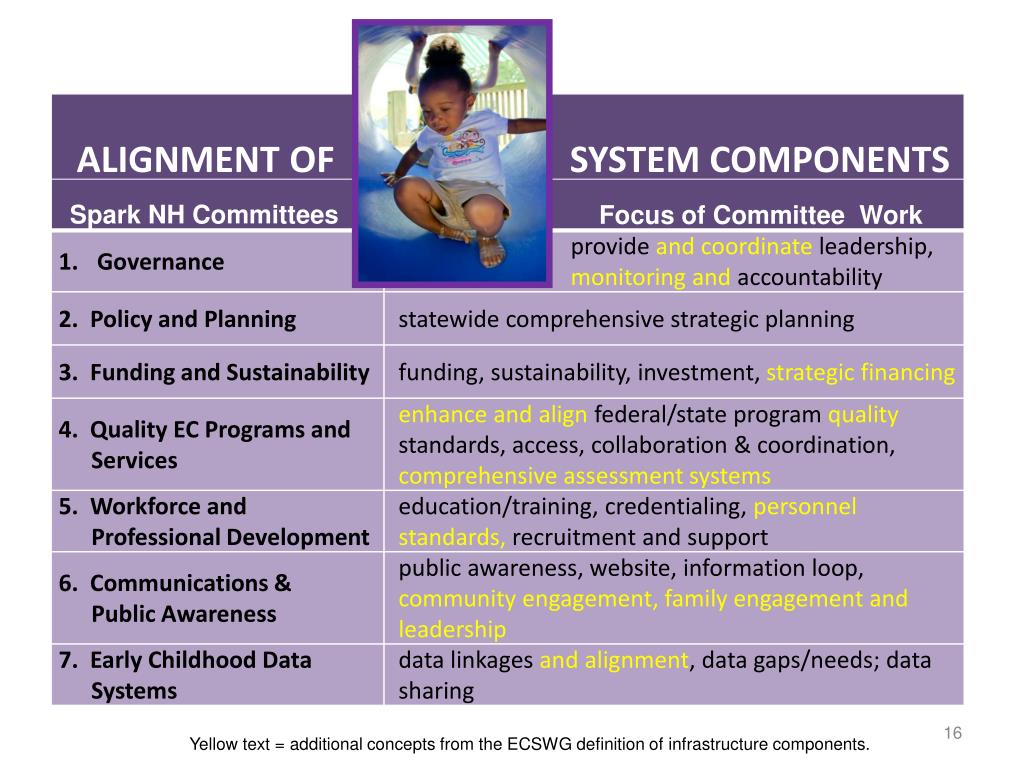 Spark NH Committees Focus of Committee Work Yellow text = additional concepts from the ECSWG definition of infrastructure components.
