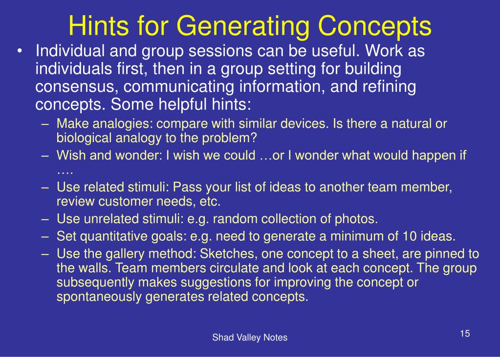 The Activity of Concept Generation • After identifying a set of customer needs and establishing target product specifications, the development team is faced with the following questions: • What existing solution concepts, if any, could be successfully adapted for this application? • What new concepts might satisfy the established needs and specifications? • What methods can be used to facilitate the concept generation process? Shad Valley Notes