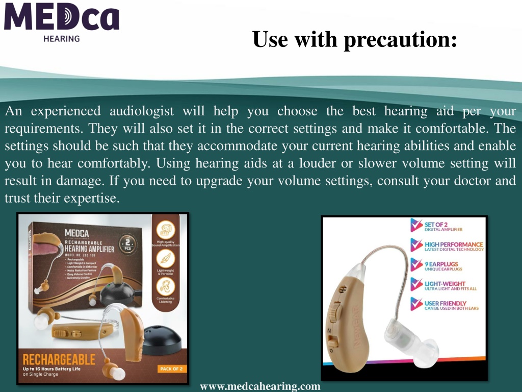 Use with precaution: An experienced audiologist will help you choose the best hearing aid per your requirements. They will also set it in the correct settings and make it comfortable. The settings should be such that they accommodate your current hearing abilities and enable you to hear comfortably. Using hearing aids at a louder or slower volume setting will result in damage. If you need to upgrade your volume settings, consult your doctor and trust their expertise. www.medcahearing.com