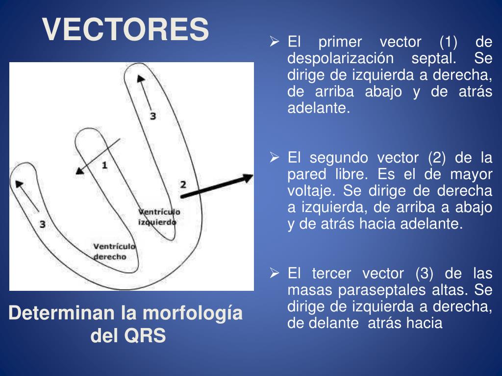 VECTORES • El primer vector (1) de despolarización septal. Se dirige de izquierda a derecha, de arriba abajo y de atrás adelante. • El segundo vector (2) de la pared libre. Es el de mayor voltaje. Se dirige de derecha a izquierda, de arriba a abajo y de atrás hacia adelante. • El tercer vector (3) de las masas paraseptales altas. Se dirige de izquierda a derecha, de delante atrás hacia Determinan la morfología del QRS