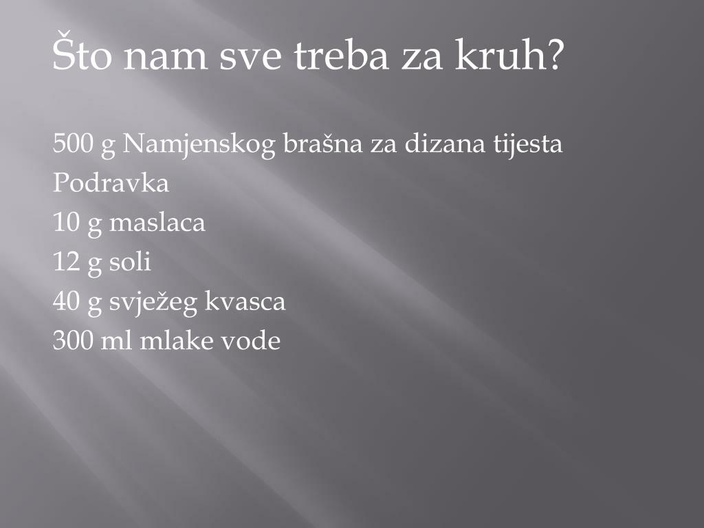 Što nam sve treba za kruh? 500 g Namjenskog brašna za dizana tijesta Podravka 10 g maslaca 12 g soli 40 g svježeg kvasca 300 ml mlake vode