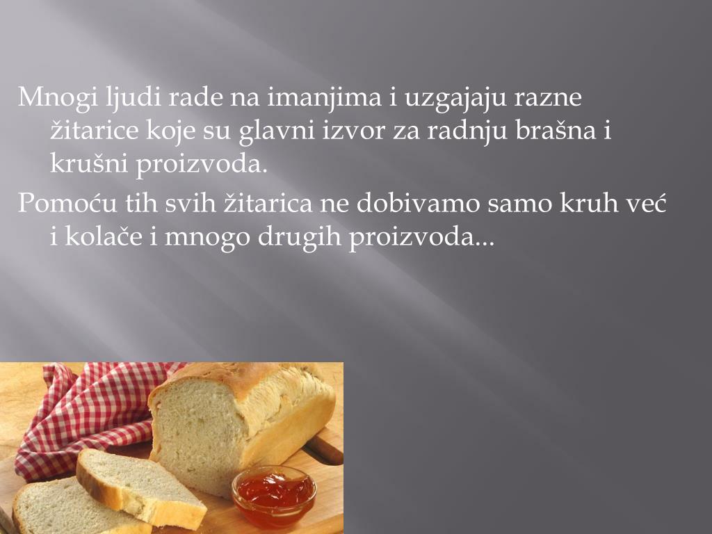 Mnogi ljudi rade na imanjima i uzgajaju razne žitarice koje su glavni izvor za radnju brašna i krušni proizvoda. Pomoću tih svih žitarica ne dobivamo samo kruh već i kolače i mnogo drugih proizvoda...