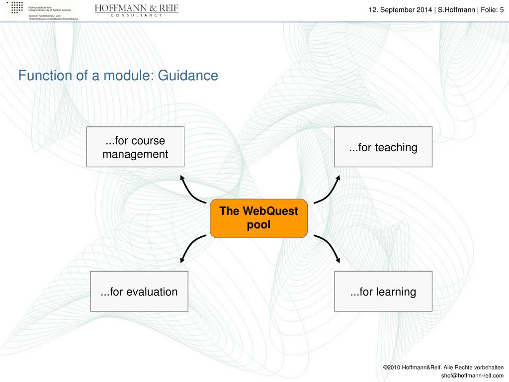 Function of a module: Guidance ...for course management ...for teaching The WebQuest pool ...for evaluation ...for learning