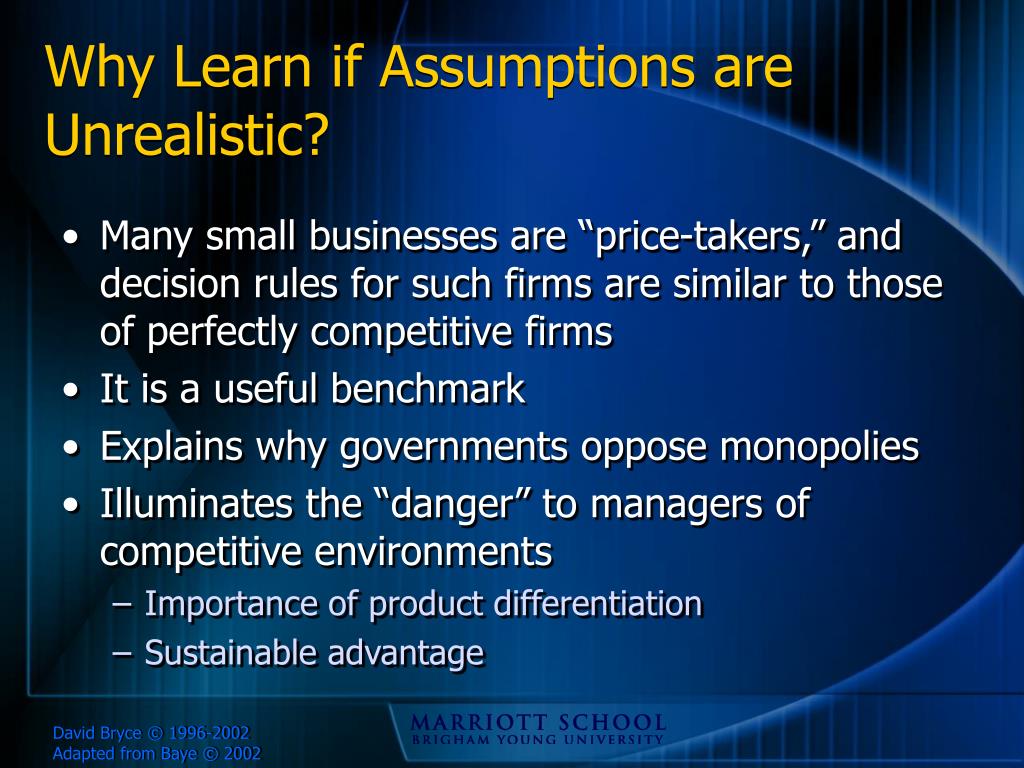 Why Learn if Assumptions are Unrealistic? • Many small businesses are “price-takers,” and decision rules for such firms are similar to those of perfectly competitive firms • It is a useful benchmark • Explains why governments oppose monopolies • Illuminates the “danger” to managers of competitive environments • Importance of product differentiation • Sustainable advantage
