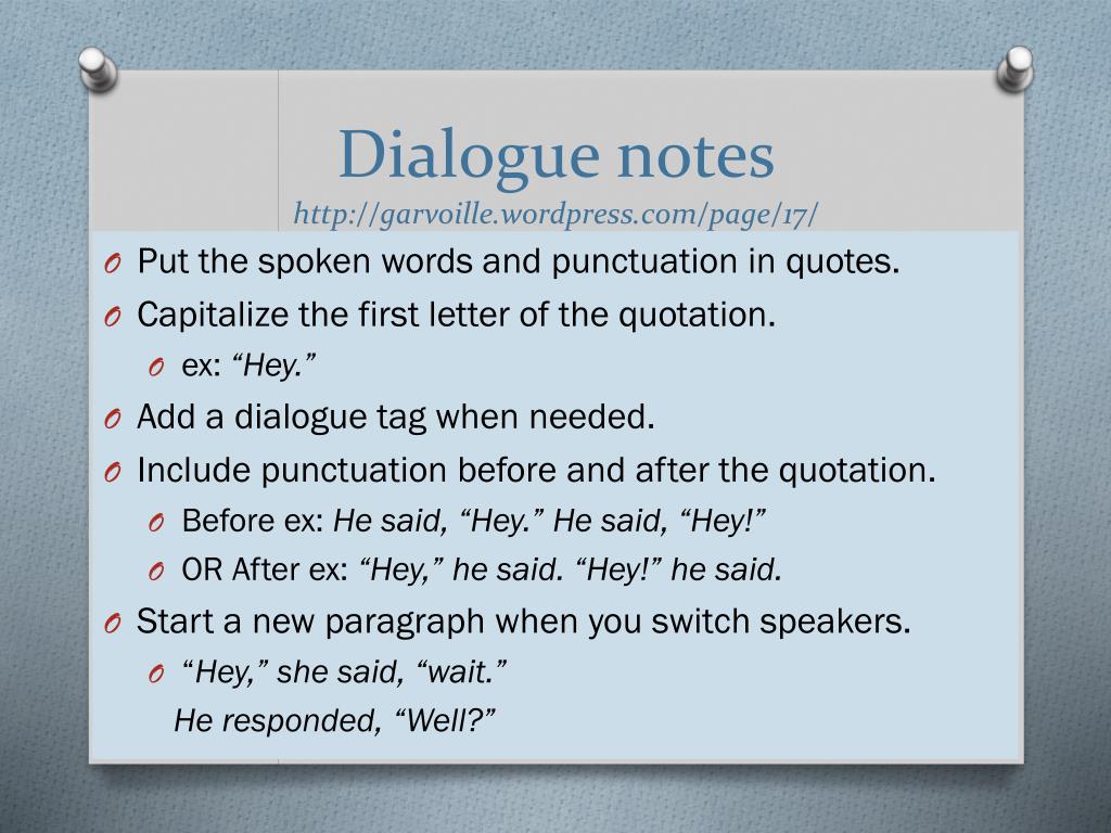Dialogue noteshttp://garvoille.wordpress.com/page/17/ • Put the spoken words and punctuation in quotes. • Capitalize the first letter of the quotation. • ex: “Hey.” • Add a dialogue tag when needed. • Include punctuation before and after the quotation. • Before ex: He said, “Hey.” He said, “Hey!” • OR After ex: “Hey,” he said. “Hey!” he said. • Start a new paragraph when you switch speakers. • “Hey,” she said, “wait.” He responded, “Well?”