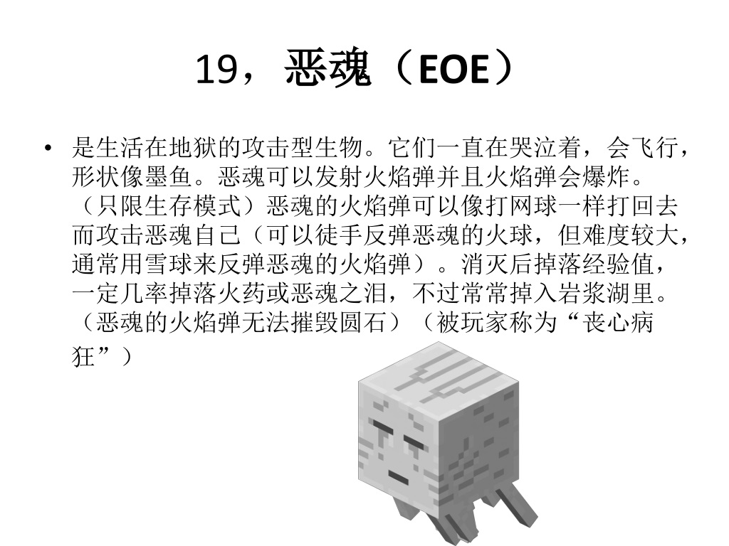 19,恶魂(EOE) • 是生活在地狱的攻击型生物。它们一直在哭泣着,会飞行,形状像墨鱼。恶魂可以发射火焰弹并且火焰弹会爆炸。(只限生存模式)恶魂的火焰弹可以像打网球一样打回去而攻击恶魂自己(可以徒手反弹恶魂的火球,但难度较大,通常用雪球来反弹恶魂的火焰弹)。消灭后掉落经验值,一定几率掉落火药或恶魂之泪,不过常常掉入岩浆湖里。(恶魂的火焰弹无法摧毁圆石)(被玩家称为“丧心病狂”)