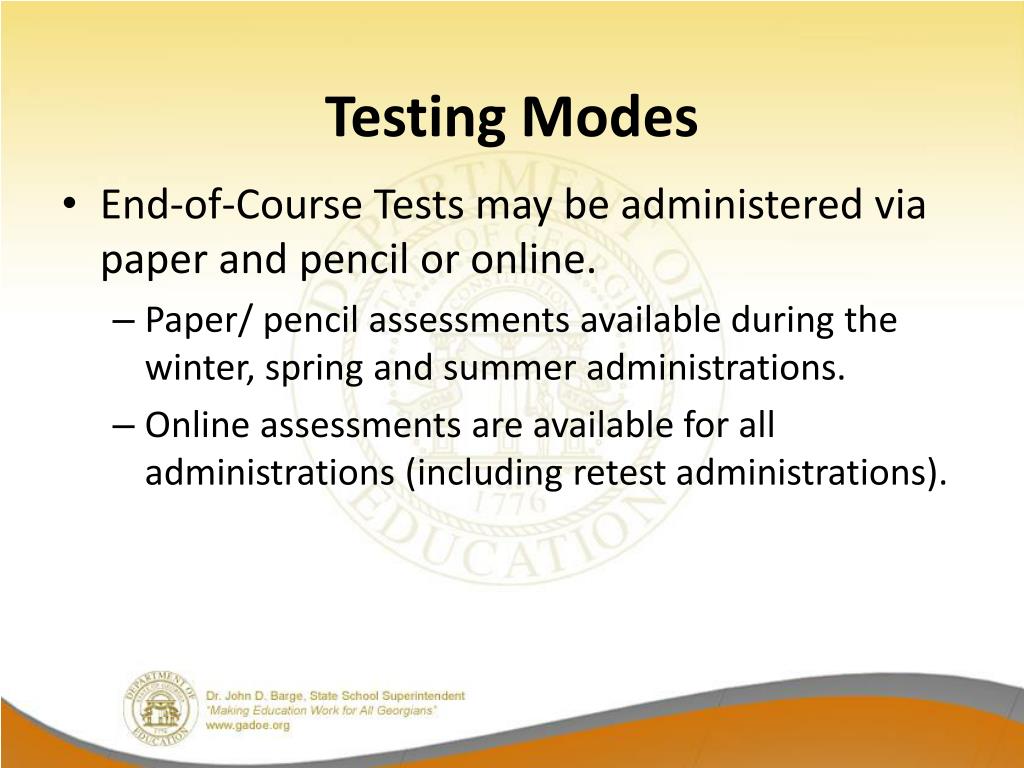 Testing Modes • End-of-Course Tests may be administered via paper and pencil or online. • Paper/ pencil assessments available during the winter, spring and summer administrations. • Online assessments are available for all administrations (including retest administrations).