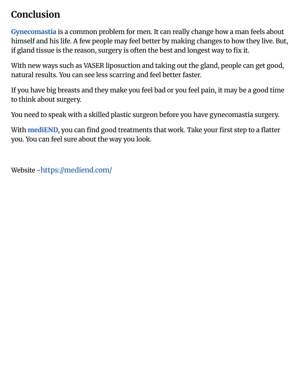 Conclusion Gynecomastia is a common problem for men. It can really change how a man feels about himself and his life. A few people may feel better by making changes to how they live. But, if gland tissue is the reason, surgery is often the best and longest way to fix it. With new ways such as VASER liposuction and taking out the gland, people can get good, natural results. You can see less scarring and feel better faster. If you have big breasts and they make you feel bad or you feel pain, it may be a good time to think about surgery. You need to speak with a skilled plastic surgeon before you have gynecomastia surgery. With mediEND, you can find good treatments that work. Take your first step to a flatter you. You can feel sure about the way you look. Website -https://mediend.com/