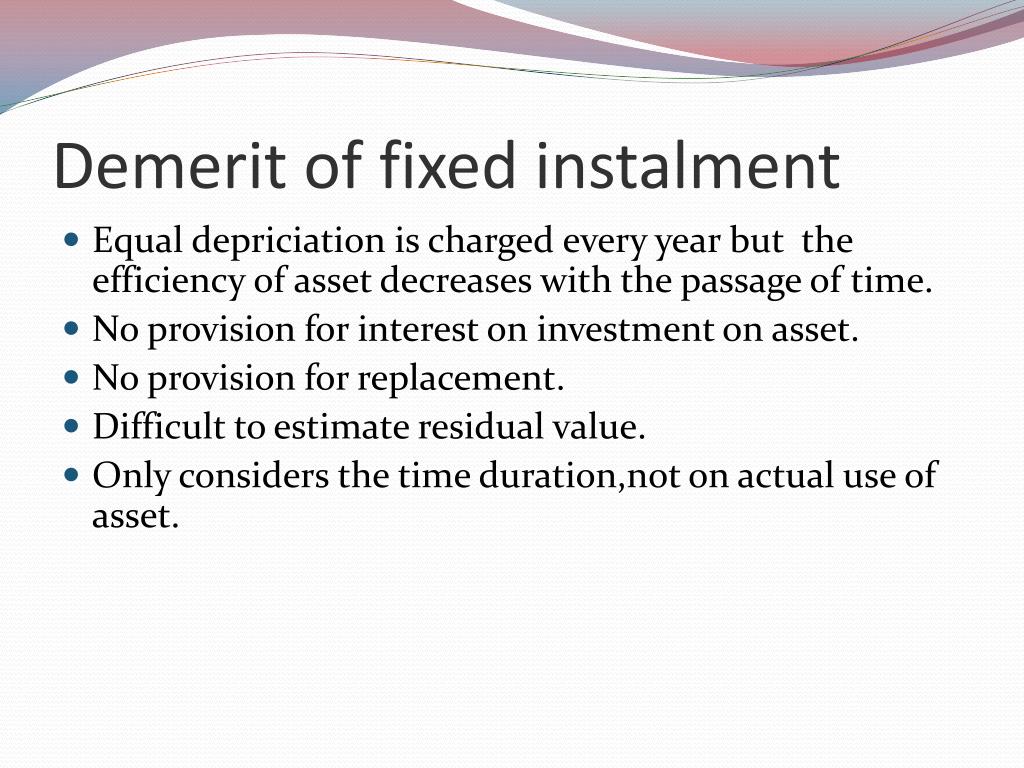 Demerit of fixed instalment • Equal depriciation is charged every year but the efficiency of asset decreases with the passage of time. • No provision for interest on investment on asset. • No provision for replacement. • Difficult to estimate residual value. • Only considers the time duration,not on actual use of asset.