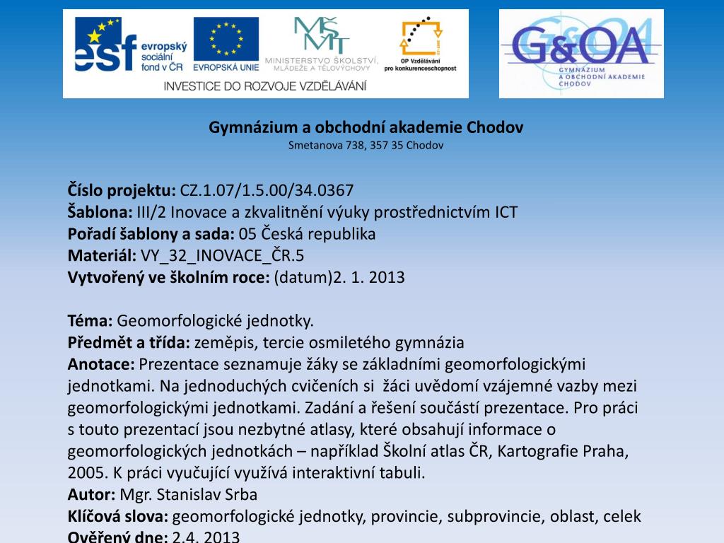 Gymnázium a obchodní akademie Chodov Smetanova 738, 357 35 Chodov Číslo projektu: CZ.1.07/1.5.00/34.0367 Šablona: III/2Inovace a zkvalitnění výuky prostřednictvím ICT Pořadí šablony a sada: 05 Česká republika Materiál: VY_32_INOVACE_ČR.5 Vytvořený ve školním roce: (datum)2. 1. 2013 Téma: Geomorfologické jednotky. Předmět a třída: zeměpis, tercie osmiletého gymnázia Anotace: Prezentace seznamuje žáky se základními geomorfologickými jednotkami. Na jednoduchých cvičeních si žáci uvědomí vzájemné vazby mezi geomorfologickými jednotkami. Zadání a řešení součástí prezentace. Pro práci s touto prezentací jsou nezbytné atlasy, které obsahují informace o geomorfologických jednotkách – například Školní atlas ČR, Kartografie Praha, 2005. K práci vyučující využívá interaktivní tabuli. Autor: Mgr. Stanislav Srba Klíčová slova: geomorfologické jednotky, provincie, subprovincie, oblast, celek Ověřený dne: 2.4. 2013