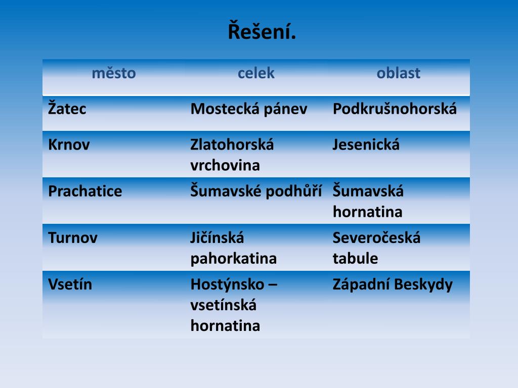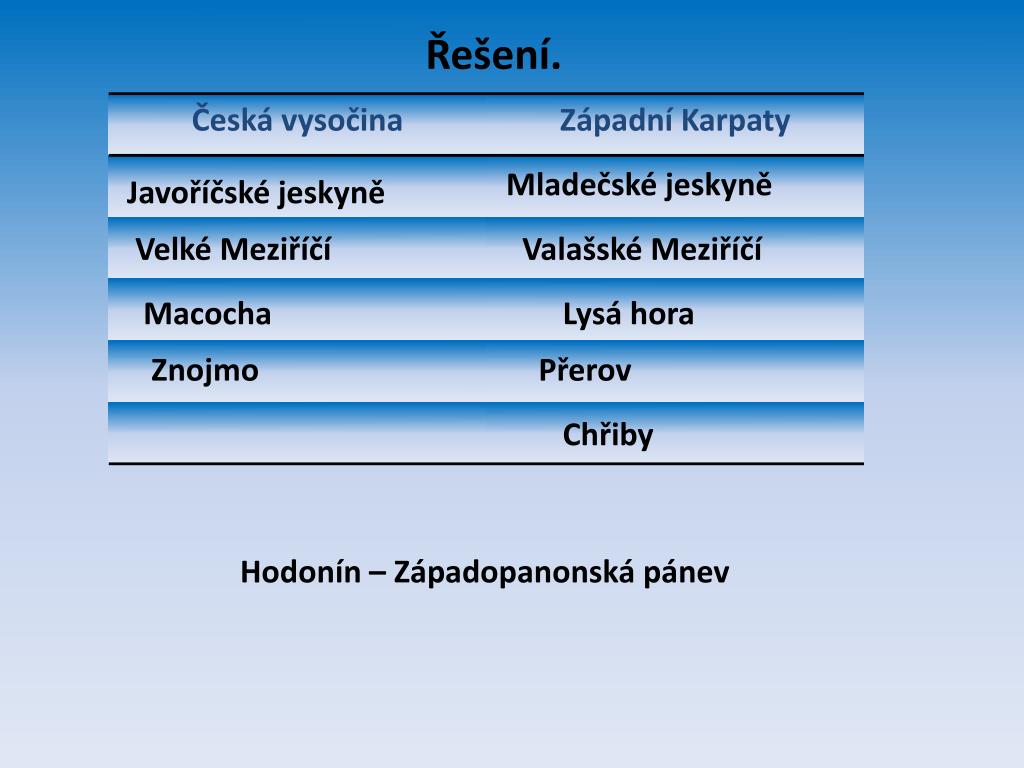 Řešení. Mladečské jeskyně Javoříčské jeskyně Velké Meziříčí Valašské Meziříčí Macocha Lysá hora Znojmo Přerov Chřiby Hodonín – Západopanonská pánev