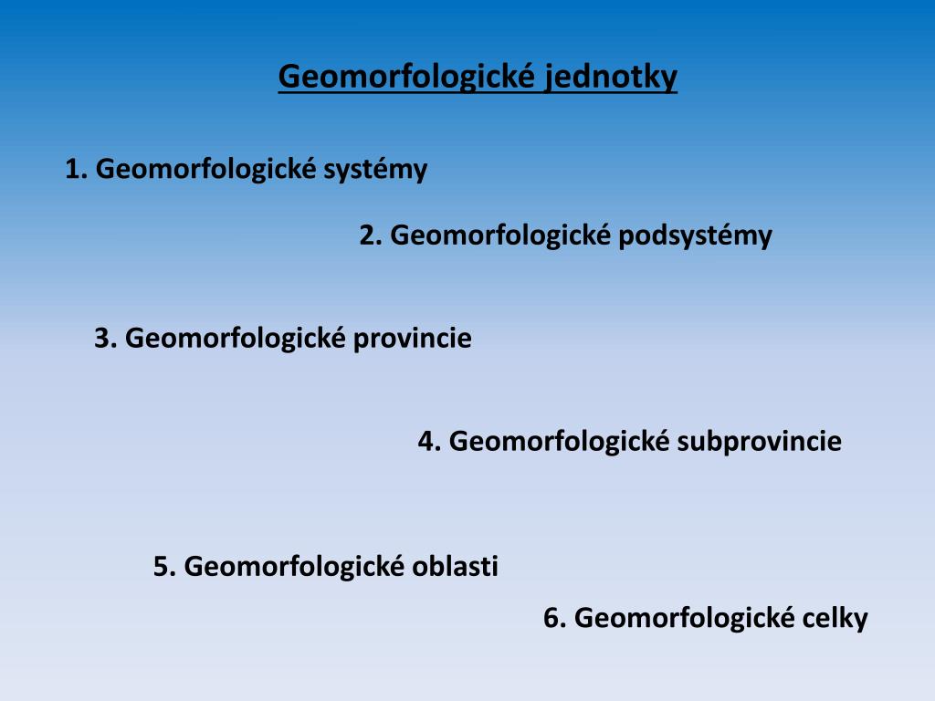Geomorfologické jednotky 1. Geomorfologické systémy 2. Geomorfologické podsystémy 3. Geomorfologické provincie 4. Geomorfologické subprovincie 5. Geomorfologické oblasti 6. Geomorfologické celky