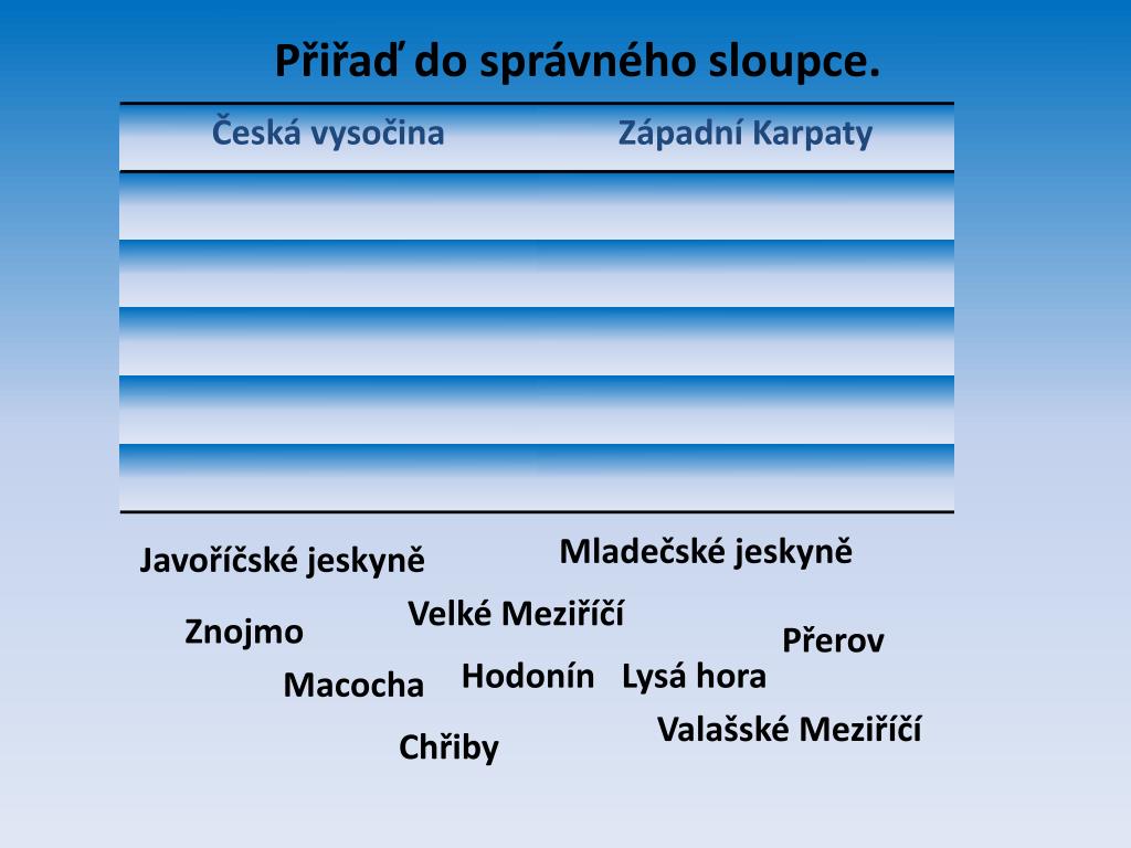 Přiřaď do správného sloupce. Mladečské jeskyně Javoříčské jeskyně Velké Meziříčí Znojmo Přerov Hodonín Lysá hora Macocha Valašské Meziříčí Chřiby
