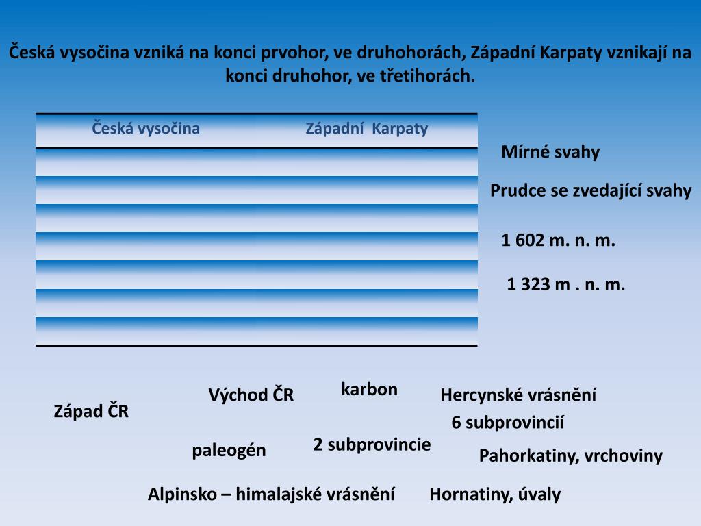 Česká vysočina vzniká na konci prvohor, ve druhohorách, Západní Karpaty vznikají na konci druhohor, ve třetihorách. Mírné svahy Prudce se zvedající svahy 1 602 m. n. m. 1 323 m . n. m. karbon Východ ČR Hercynské vrásnění Západ ČR 6 subprovincií 2 subprovincie paleogén Pahorkatiny, vrchoviny Alpinsko – himalajské vrásnění Hornatiny, úvaly