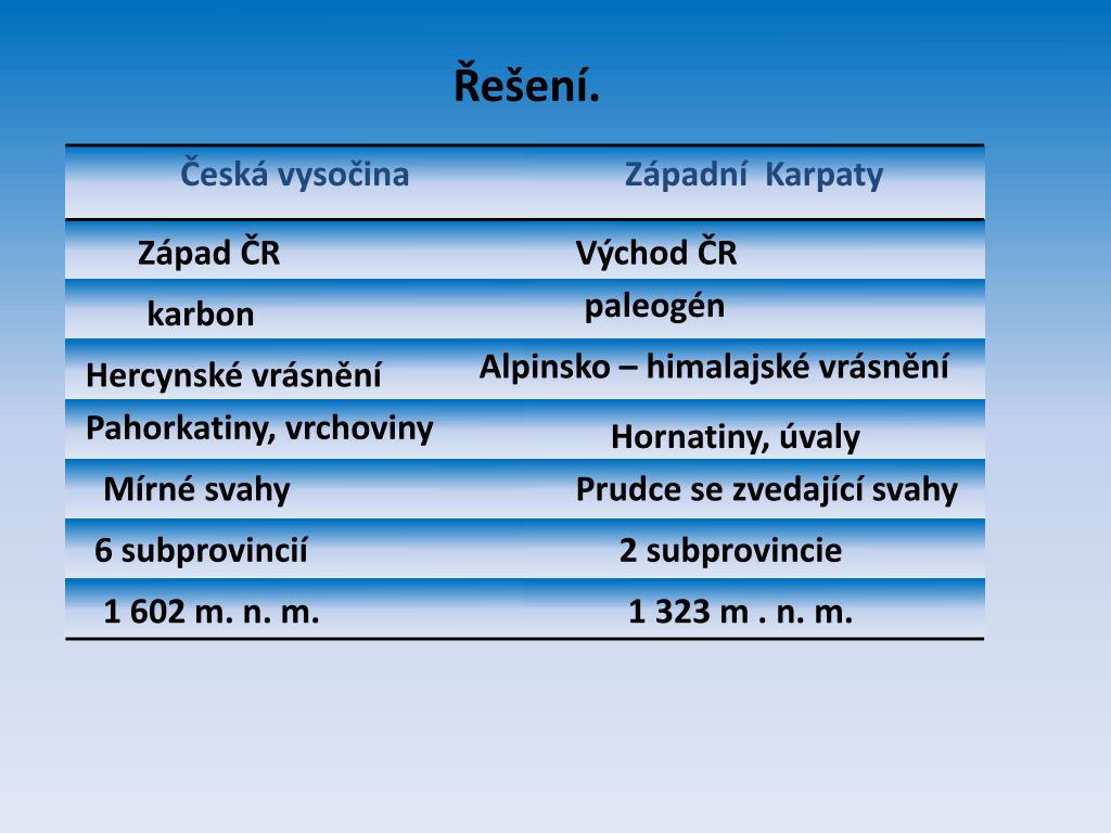 Řešení. Západ ČR Východ ČR paleogén karbon Alpinsko – himalajské vrásnění Hercynské vrásnění Pahorkatiny, vrchoviny Hornatiny, úvaly Mírné svahy Prudce se zvedající svahy 6 subprovincií 2 subprovincie 1 602 m. n. m. 1 323 m . n. m.