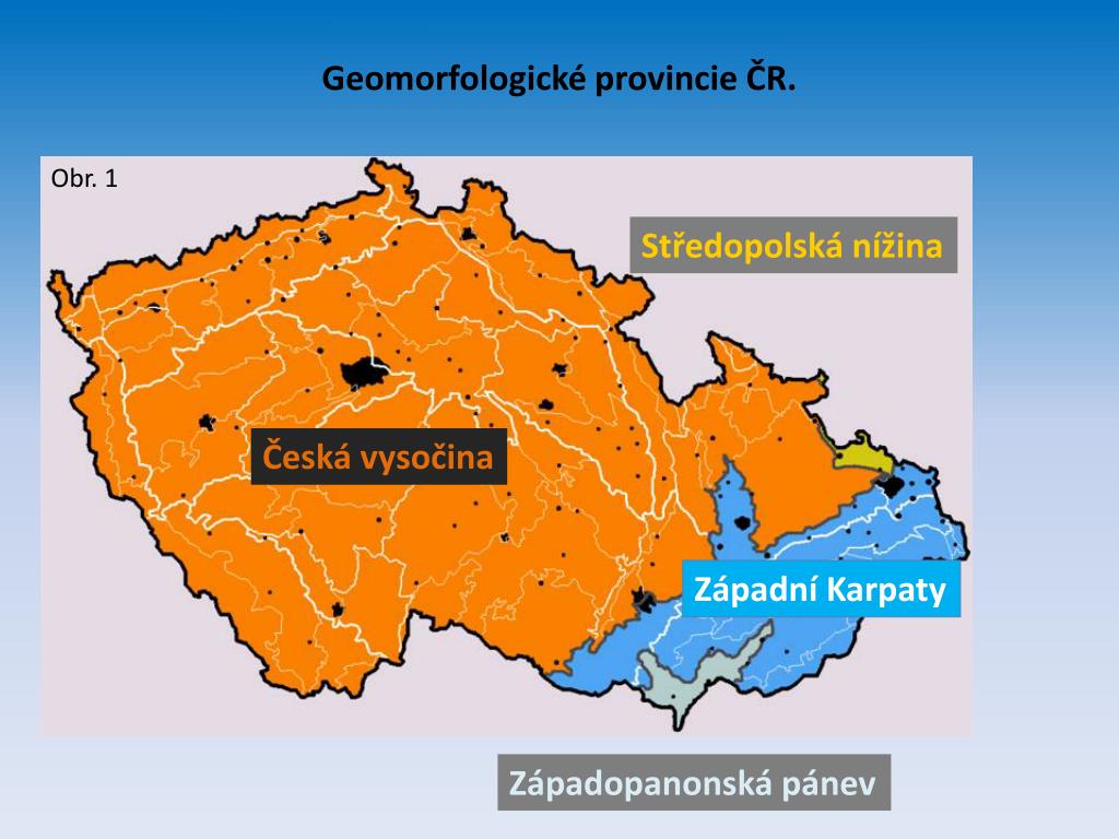 Geomorfologické provincie ČR. Obr. 1 Středopolská nížina Česká vysočina Západní Karpaty Západopanonská pánev