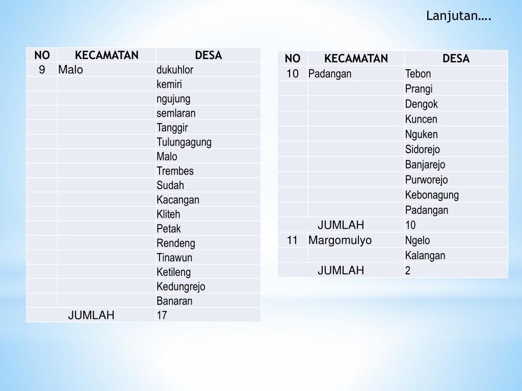 Lanjutan…. • Ancamanbencanabanjiruntukwilayahbojonegoro, banjirbengawan solo ada 16 kecamatandan 146 desameliputi: