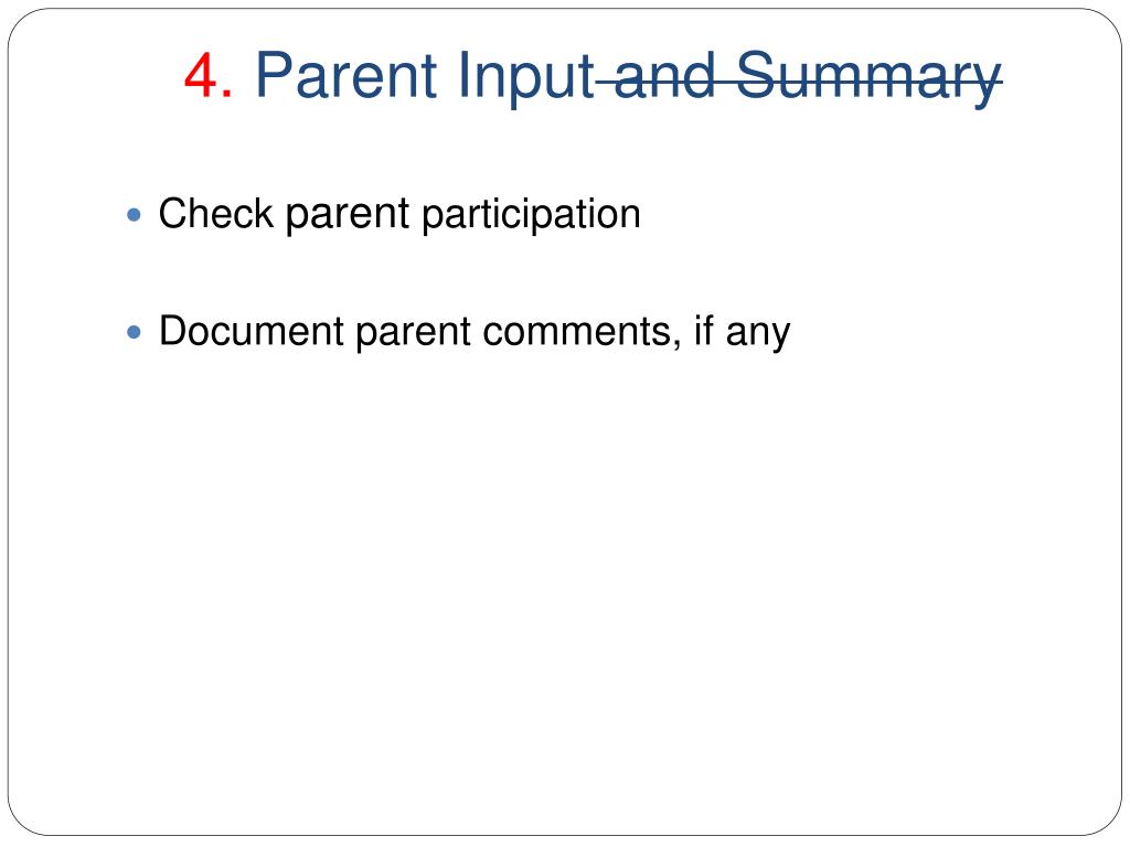 4. Parent Input and Summary • Check parent participation • Document parent comments, if any