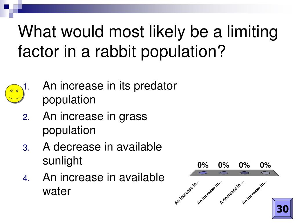 What would most likely be a limiting factor in a rabbit population? • An increase in its predator population • An increase in grass population • A decrease in available sunlight • An increase in available water 30