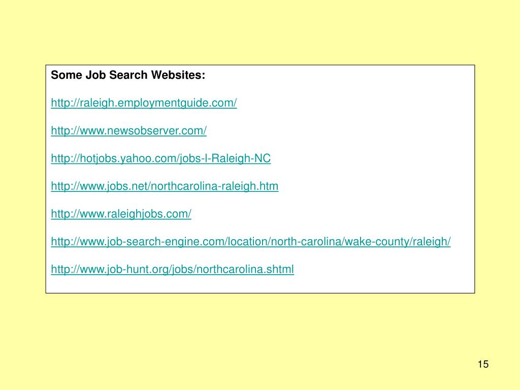 Some Job Search Websites: http://raleigh.employmentguide.com/ http://www.newsobserver.com/ http://hotjobs.yahoo.com/jobs-l-Raleigh-NC http://www.jobs.net/northcarolina-raleigh.htm http://www.raleighjobs.com/ http://www.job-search-engine.com/location/north-carolina/wake-county/raleigh/ http://www.job-hunt.org/jobs/northcarolina.shtml