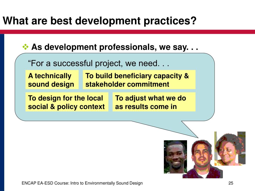 What are best development practices? • As development professionals, we say. . . “For a successful project, we need. . . A technically sound design To build beneficiary capacity & stakeholder commitment To design for the local social & policy context To adjust what we do as results come in ENCAP EA-ESD Course: Intro to Environmentally Sound Design