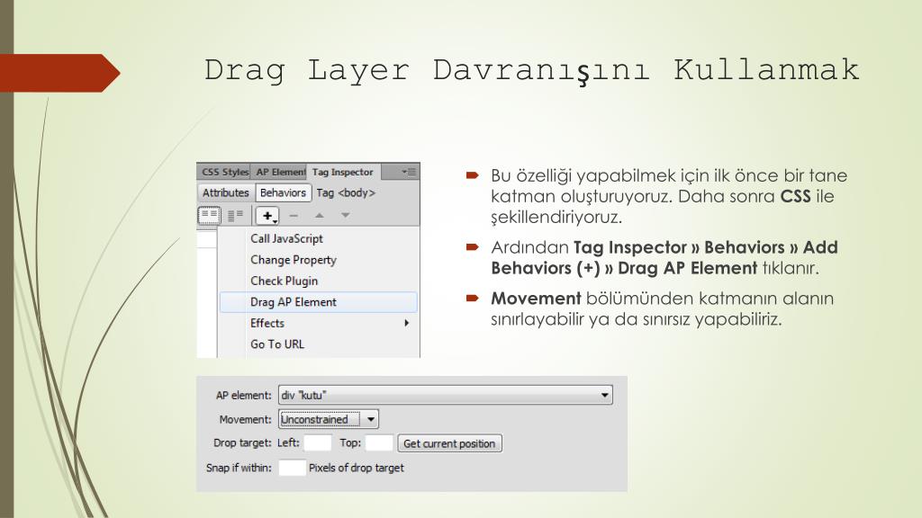 DragLayer Davranışını Kullanmak • Bu özelliği yapabilmek için ilk önce bir tane katman oluşturuyoruz. Daha sonra CSS ile şekillendiriyoruz. • Ardından TagInspector » Behaviors » AddBehaviors (+) » Drag AP Element tıklanır. • Movementbölümünden katmanın alanın sınırlayabilir ya da sınırsız yapabiliriz.