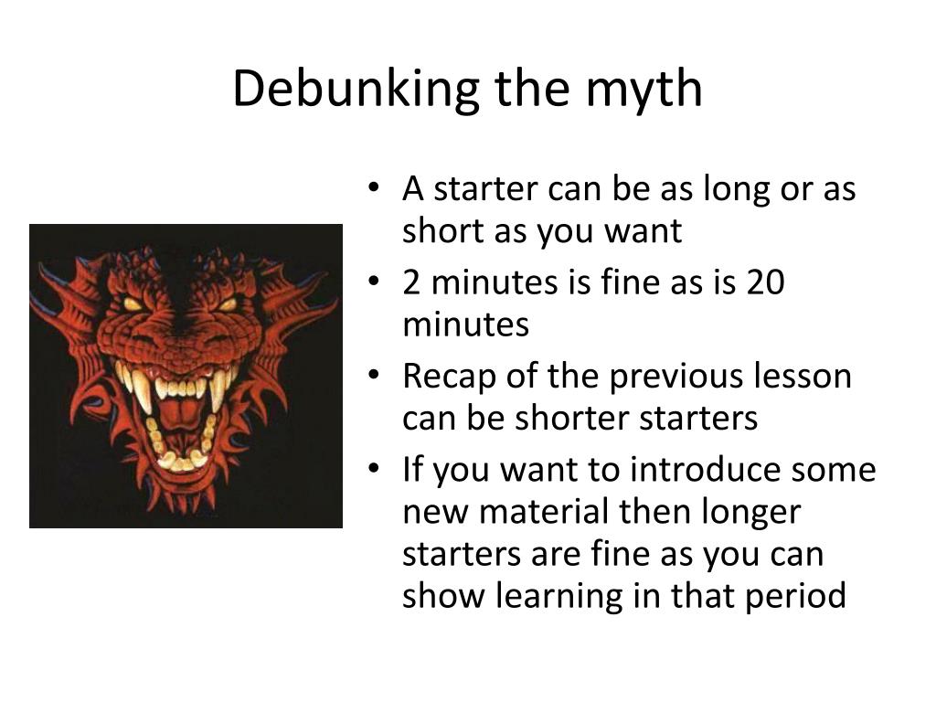 Debunking the myth • A starter can be as long or as short as you want • 2 minutes is fine as is 20 minutes • Recap of the previous lesson can be shorter starters • If you want to introduce some new material then longer starters are fine as you can show learning in that period