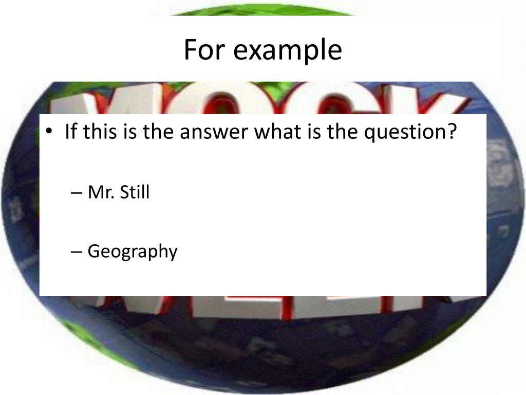 For example • If this is the answer what is the question? • Mr. Still • Geography