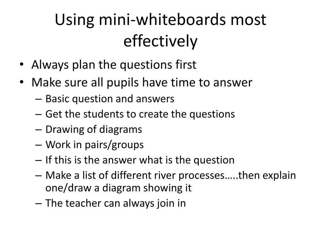 Using mini-whiteboards most effectively • Always plan the questions first • Make sure all pupils have time to answer • Basic question and answers • Get the students to create the questions • Drawing of diagrams • Work in pairs/groups • If this is the answer what is the question • Make a list of different river processes…..then explain one/draw a diagram showing it • The teacher can always join in