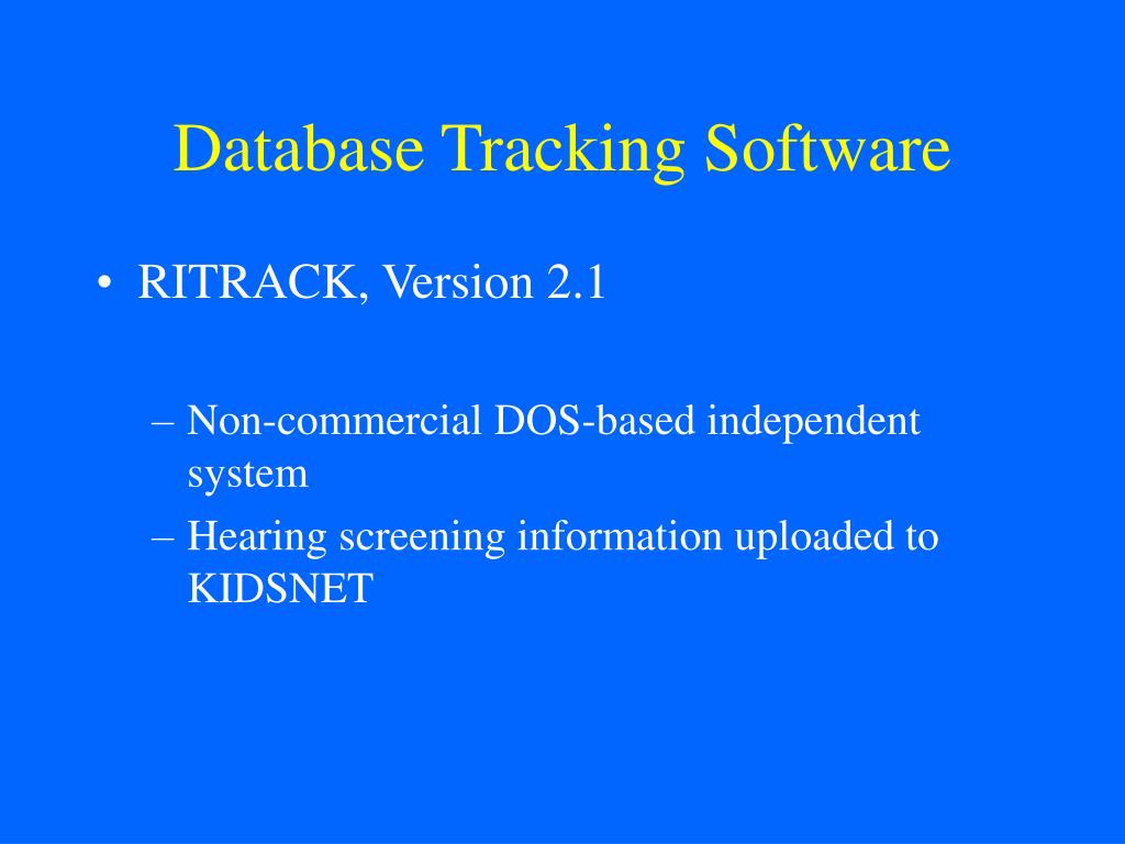 Database Tracking Software • RITRACK, Version 2.1 • Non-commercial DOS-based independent system • Hearing screening information uploaded to KIDSNET