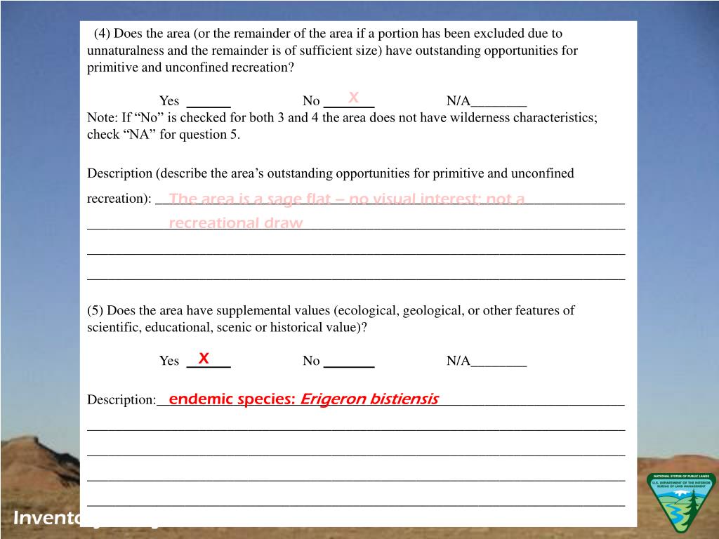 (4) Does the area (or the remainder of the area if a portion has been excluded due to unnaturalness and the remainder is of sufficient size) have outstanding opportunities for primitive and unconfined recreation? Yes No N/A________ Note: If “No” is checked for both 3 and 4 the area does not have wilderness characteristics; check “NA” for question 5. Description (describe the area’s outstanding opportunities for primitive and unconfined recreation): __________________________________________________________________________________________________________________________________________________________________________________________________________________________________________________________________________________________________________ (5) Does the area have supplemental values (ecological, geological, or other features of scientific, educational, scenic or historical value)? Yes No N/A________ Description:_______________________________________________________________________________________________________________________________________________________________________________________________________________________________________________________________________________________________________________________________________________________________________________________ X The area is a sage flat – no visual interest; not a recreational draw Inventory – Adjust & Document