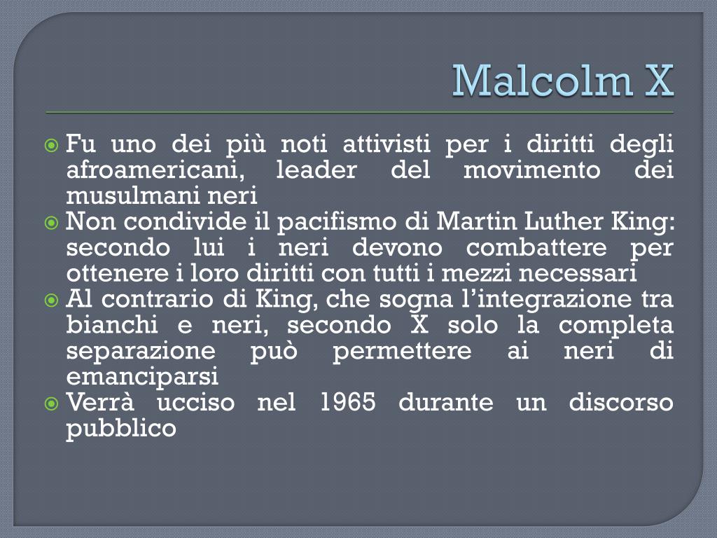 Malcolm X Fu uno dei più noti attivisti per i diritti degli afroamericani, leader del movimento dei musulmani neri Non condivide il pacifismo di Martin Luther King: secondo lui i neri devono combattere per ottenere i loro diritti con tutti i mezzi necessari Al contrario di King, che sogna l’integrazione tra bianchi e neri, secondo X solo la completa separazione può permettere ai neri di emanciparsi Verrà ucciso nel 1965 durante un discorso pubblico