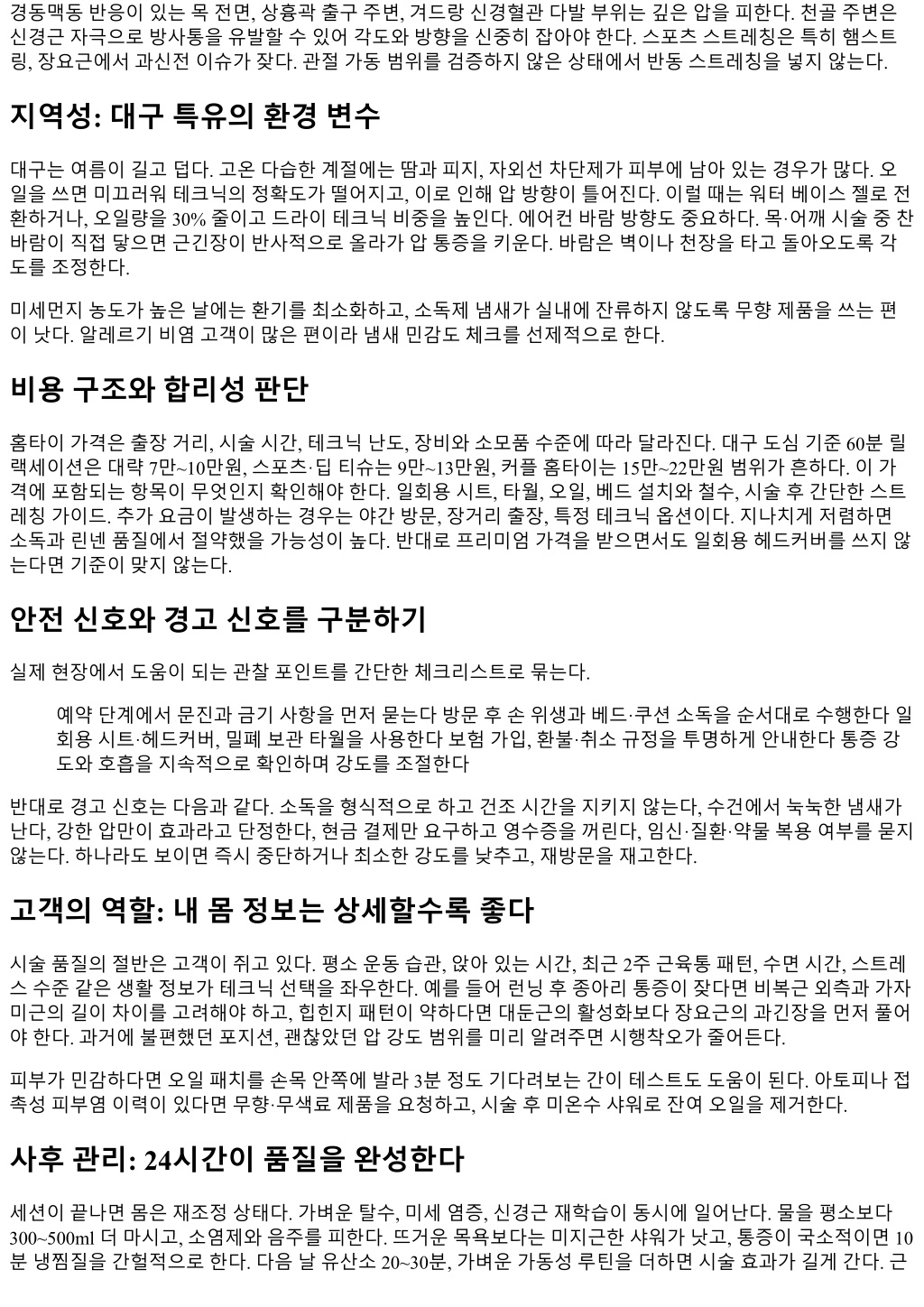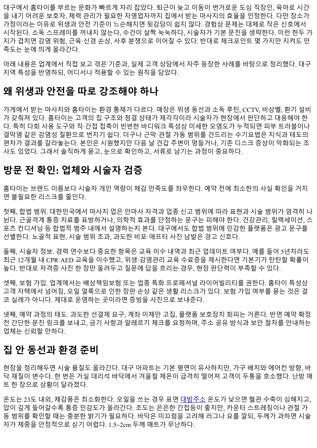 경동맥동반응이있는목전면, 상흉곽출구주변, 겨드랑신경혈관다발부위는깊은압을피한다. 천골주변은 신경근자극으로방사통을유발할수있어각도와방향을신중히잡아야한다. 스포츠스트레칭은특히햄스트 링, 장요근에서과신전이슈가잦다. 관절가동범위를검증하지않은상태에서반동스트레칭을넣지않는다. 지역성: 대구특유의환경변수 대구는여름이길고덥다. 고온다습한계절에는땀과피지, 자외선차단제가피부에남아있는경우가많다. 오 일을쓰면미끄러워테크닉의정확도가떨어지고, 이로인해압방향이틀어진다. 이럴때는워터베이스젤로전 환하거나, 오일량을 30% 줄이고드라이테크닉비중을높인다. 에어컨바람방향도중요하다. 목·어깨시술중찬 바람이직접닿으면근긴장이반사적으로올라가압통증을키운다. 바람은벽이나천장을타고돌아오도록각 도를조정한다. 미세먼지농도가높은날에는환기를최소화하고, 소독제냄새가실내에잔류하지않도록무향제품을쓰는편 이낫다. 알레르기비염고객이많은편이라냄새민감도체크를선제적으로한다. 비용구조와합리성판단 홈타이가격은출장거리, 시술시간, 테크닉난도, 장비와소모품수준에따라달라진다. 대구도심기준 60분릴 랙세이션은대략 7만~10만원, 스포츠·딥티슈는 9만~13만원, 커플홈타이는 15만~22만원범위가흔하다. 이가 격에포함되는항목이무엇인지확인해야한다. 일회용시트, 타월, 오일, 베드설치와철수, 시술후간단한스트 레칭가이드. 추가요금이발생하는경우는야간방문, 장거리출장, 특정테크닉옵션이다. 지나치게저렴하면 소독과린넨품질에서절약했을가능성이높다. 반대로프리미엄가격을받으면서도일회용헤드커버를쓰지않 는다면기준이맞지않는다. 안전신호와경고신호를구분하기 실제현장에서도움이되는관찰포인트를간단한체크리스트로묶는다. 예약단계에서문진과금기사항을먼저묻는다방문후손위생과베드·쿠션소독을순서대로수행한다일 회용시트·헤드커버, 밀폐보관타월을사용한다보험가입, 환불·취소규정을투명하게안내한다통증강 도와호흡을지속적으로확인하며강도를조절한다 반대로경고신호는다음과같다. 소독을형식적으로하고건조시간을지키지않는다, 수건에서눅눅한냄새가 난다, 강한압만이효과라고단정한다, 현금결제만요구하고영수증을꺼린다, 임신·질환·약물복용여부를묻지 않는다. 하나라도보이면즉시중단하거나최소한강도를낮추고, 재방문을재고한다. 고객의역할: 내몸정보는상세할수록좋다 시술품질의절반은고객이쥐고있다. 평소운동습관, 앉아있는시간, 최근 2주근육통패턴, 수면시간, 스트레 스수준같은생활정보가테크닉선택을좌우한다. 예를들어런닝후종아리통증이잦다면비복근외측과가자 미근의길이차이를고려해야하고, 힙힌지패턴이약하다면대둔근의활성화보다장요근의과긴장을먼저풀어 야한다. 과거에불편했던포지션, 괜찮았던압강도범위를미리알려주면시행착오가줄어든다. 피부가민감하다면오일패치를손목안쪽에발라 3분정도기다려보는간이테스트도도움이된다. 아토피나접 촉성피부염이력이있다면무향·무색료제품을요청하고, 시술후미온수샤워로잔여오일을제거한다. 사후관리: 24시간이품질을완성한다 세션이끝나면몸은재조정상태다. 가벼운탈수, 미세염증, 신경근재학습이동시에일어난다. 물을평소보다 300~500ml 더마시고, 소염제와음주를피한다. 뜨거운목욕보다는미지근한샤워가낫고, 통증이국소적이면 10 분냉찜질을간헐적으로한다. 다음날유산소 20~30분, 가벼운가동성루틴을더하면시술효과가길게간다. 근
