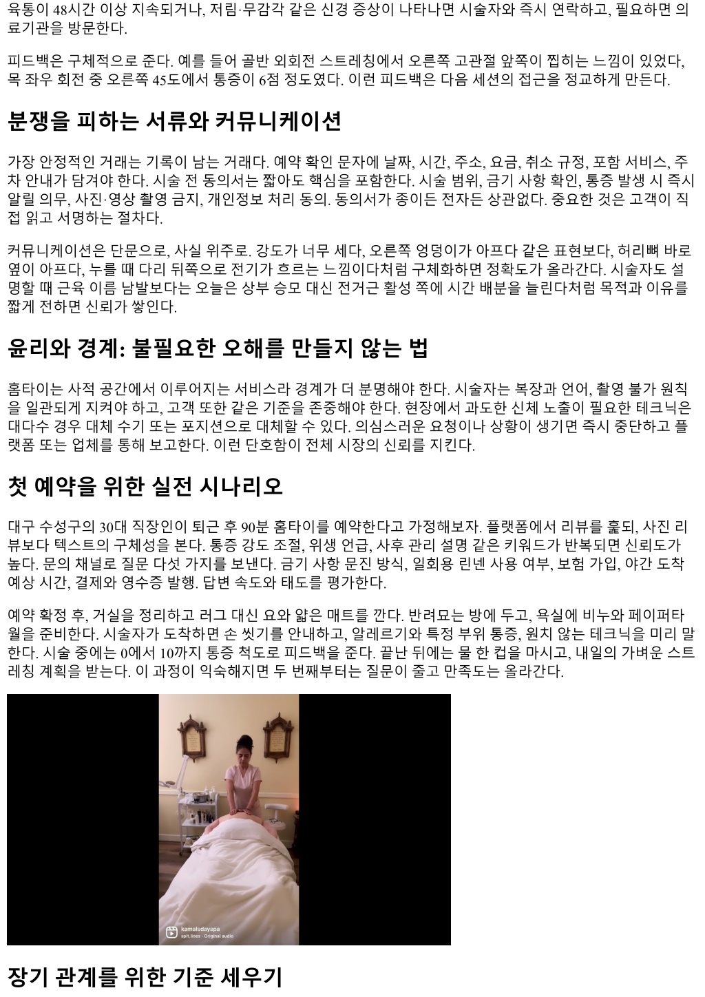 육통이 48시간이상지속되거나, 저림·무감각같은신경증상이나타나면시술자와즉시연락하고, 필요하면의 료기관을방문한다. 피드백은구체적으로준다. 예를들어골반외회전스트레칭에서오른쪽고관절앞쪽이찝히는느낌이있었다, 목좌우회전중오른쪽 45도에서통증이 6점정도였다. 이런피드백은다음세션의접근을정교하게만든다. 분쟁을피하는서류와커뮤니케이션 가장안정적인거래는기록이남는거래다. 예약확인문자에날짜, 시간, 주소, 요금, 취소규정, 포함서비스, 주 차안내가담겨야한다. 시술전동의서는짧아도핵심을포함한다. 시술범위, 금기사항확인, 통증발생시즉시 알릴의무, 사진·영상촬영금지, 개인정보처리동의. 동의서가종이든전자든상관없다. 중요한것은고객이직 접읽고서명하는절차다. 커뮤니케이션은단문으로, 사실위주로. 강도가너무세다, 오른쪽엉덩이가아프다같은표현보다, 허리뼈바로 옆이아프다, 누를때다리뒤쪽으로전기가흐르는느낌이다처럼구체화하면정확도가올라간다. 시술자도설 명할때근육이름남발보다는오늘은상부승모대신전거근활성쪽에시간배분을늘린다처럼목적과이유를 짧게전하면신뢰가쌓인다. 윤리와경계: 불필요한오해를만들지않는법 홈타이는사적공간에서이루어지는서비스라경계가더분명해야한다. 시술자는복장과언어, 촬영불가원칙 을일관되게지켜야하고, 고객또한같은기준을존중해야한다. 현장에서과도한신체노출이필요한테크닉은 대다수경우대체수기또는포지션으로대체할수있다. 의심스러운요청이나상황이생기면즉시중단하고플 랫폼또는업체를통해보고한다. 이런단호함이전체시장의신뢰를지킨다. 첫예약을위한실전시나리오 대구수성구의 30대직장인이퇴근후 90분홈타이를예약한다고가정해보자. 플랫폼에서리뷰를훑되, 사진리 뷰보다텍스트의구체성을본다. 통증강도조절, 위생언급, 사후관리설명같은키워드가반복되면신뢰도가 높다. 문의채널로질문다섯가지를보낸다. 금기사항문진방식, 일회용린넨사용여부, 보험가입, 야간도착 예상시간, 결제와영수증발행. 답변속도와태도를평가한다. 예약확정후, 거실을정리하고러그대신요와얇은매트를깐다. 반려묘는방에두고, 욕실에비누와페이퍼타 월을준비한다. 시술자가도착하면손씻기를안내하고, 알레르기와특정부위통증, 원치않는테크닉을미리말 한다. 시술중에는 0에서 10까지통증척도로피드백을준다. 끝난뒤에는물한컵을마시고, 내일의가벼운스트 레칭계획을받는다. 이과정이익숙해지면두번째부터는질문이줄고만족도는올라간다. 장기관계를위한기준세우기