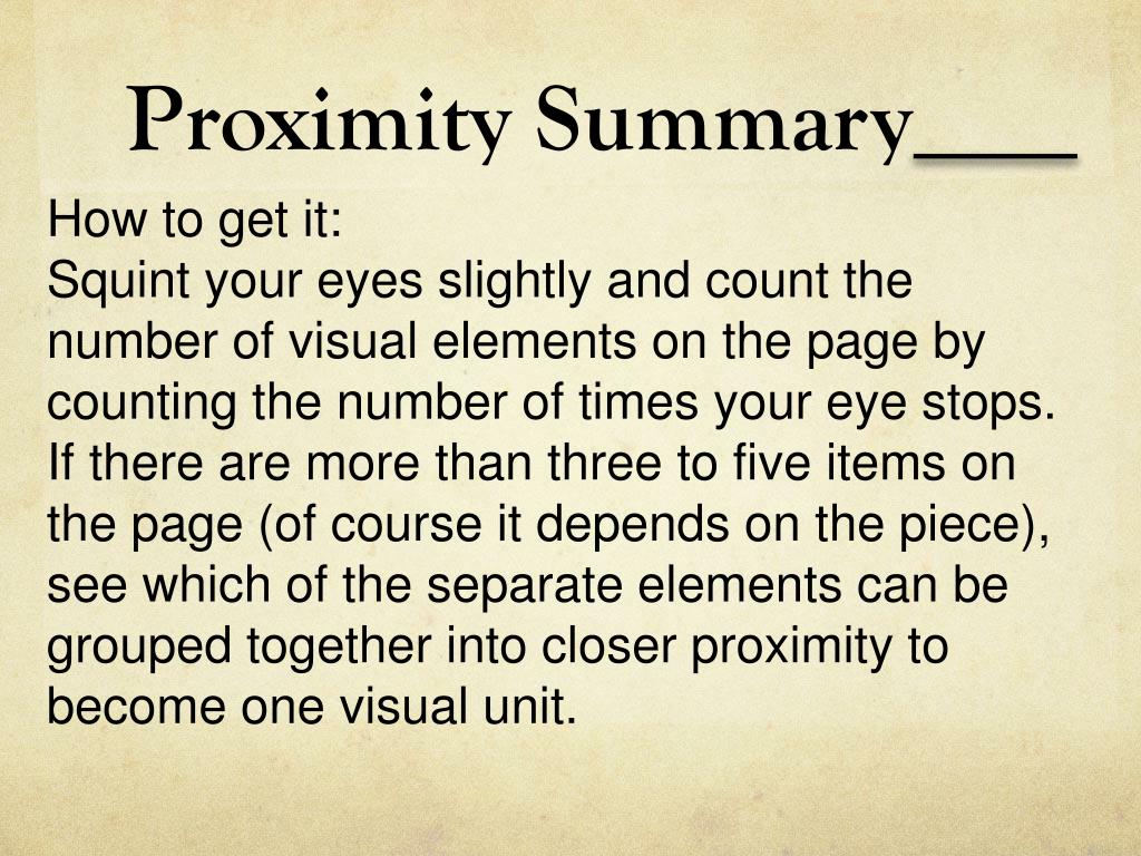 Proximity Summary When several items are in close proximity to each other, they become one visual unit rather than several separate units. Items relating to each other should be grouped together. The basic purpose of proximity is to organize.