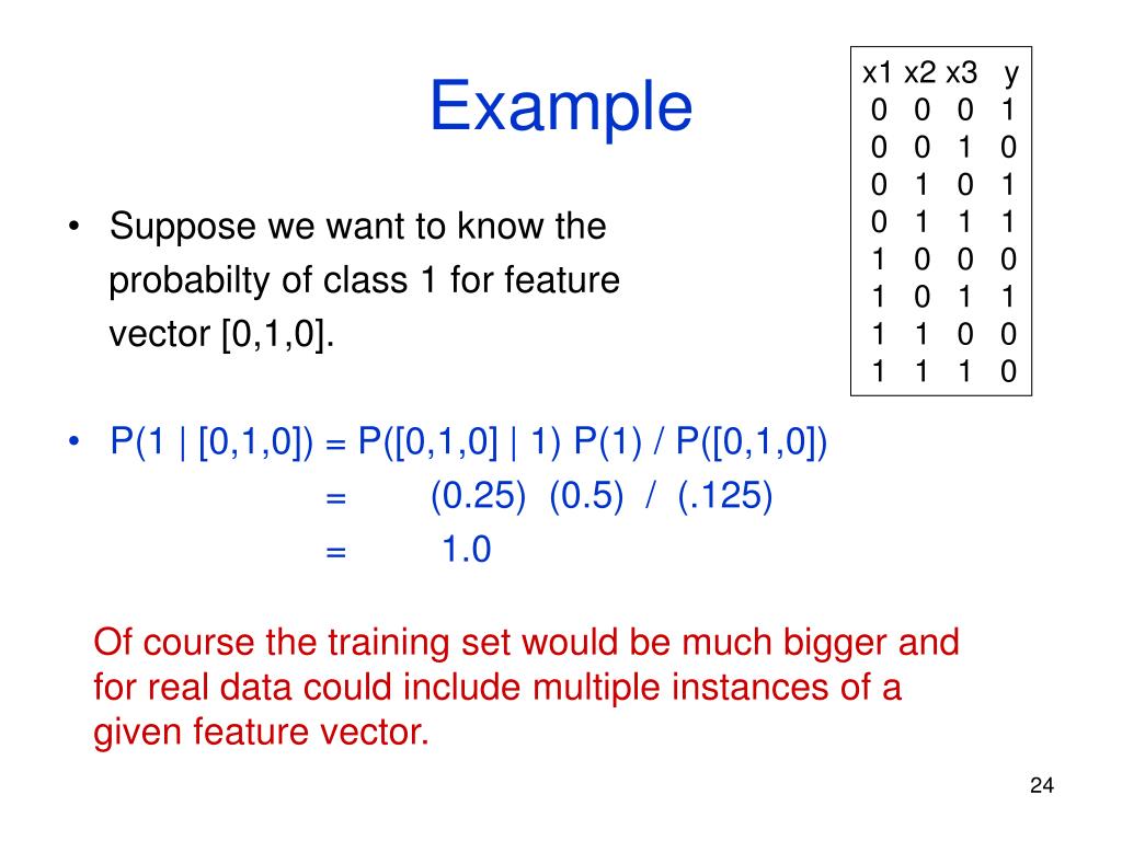 Example x1 x2 x3 y 0 0 0 1 0 0 1 0 0 1 0 1 0 1 1 1 1 0 0 0 1 0 1 1 1 1 0 0 1 1 1 0 • Suppose we want to know the probabilty of class 1 for feature vector [0,1,0]. • P(1 | [0,1,0]) = P([0,1,0] | 1) P(1) / P([0,1,0]) = (0.25) (0.5) / (.125) = 1.0 Of course the training set would be much bigger and for real data could include multiple instances of a given feature vector.