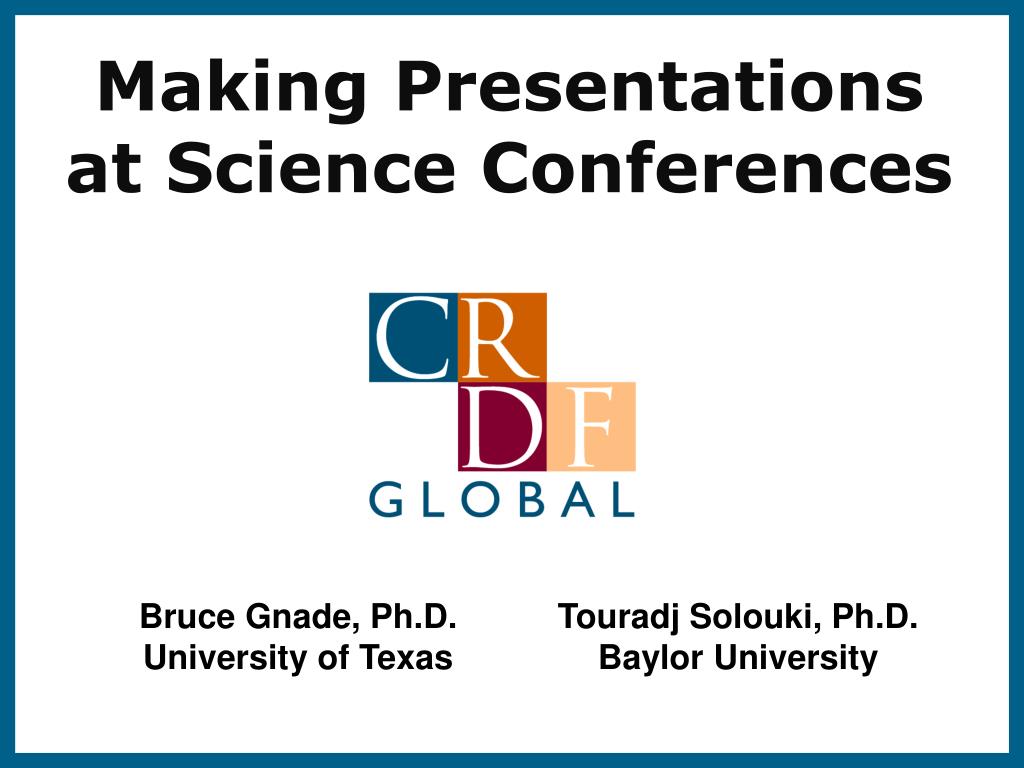Making Presentationsat Science Conferences Bruce Gnade, Ph.D.University of Texas TouradjSolouki, Ph.D.Baylor University