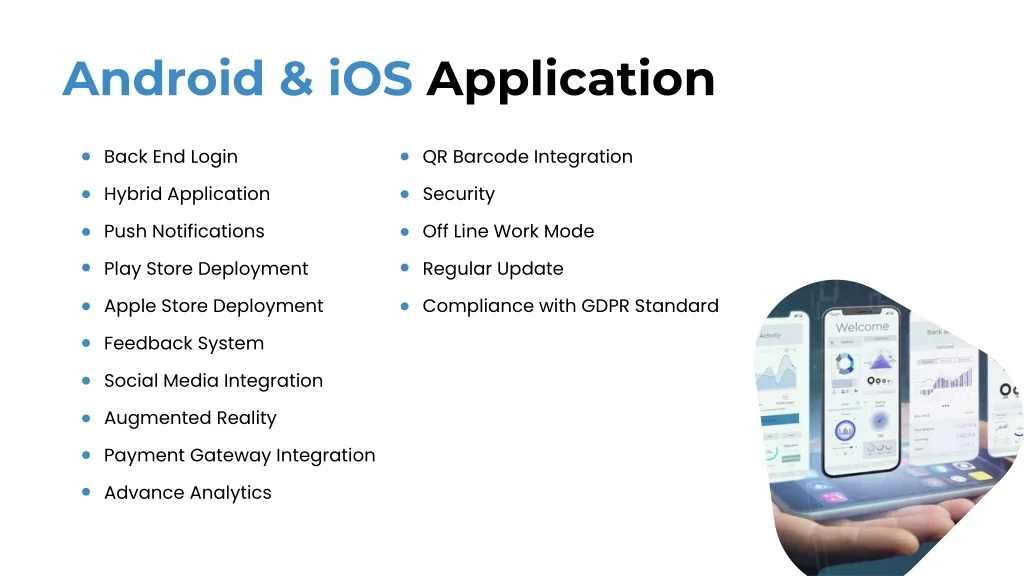 Android & iOS Application Back End Login Hybrid Application Push Notifications Play Store Deployment Apple Store Deployment Feedback System Social Media Integration Augmented Reality Payment Gateway Integration Advance Analytics QR Barcode Integration Security Off Line Work Mode Regular Update Compliance with GDPR Standard
