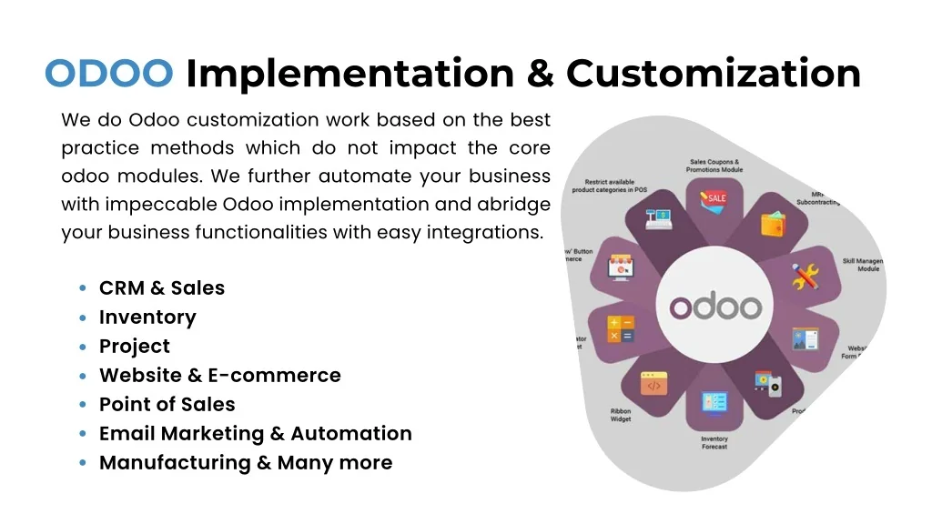 ODOO Implementation & Customization We do Odoo customization work based on the best practice methods which do not impact the core odoo modules. We further automate your business with impeccable Odoo implementation and abridge your business functionalities with easy integrations. CRM & Sales Inventory Project Website & E-commerce Point of Sales Email Marketing & Automation Manufacturing & Many more