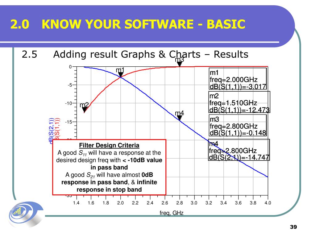 2.0 KNOW YOUR SOFTWARE - BASIC 2.5 Adding result Graphs & Charts – Results Filter Design Criteria A good S11 will have a response at the desired design freq with < -10dB value in pass band A good S21 will have almost 0dB response in pass band, & infinite response in stop band