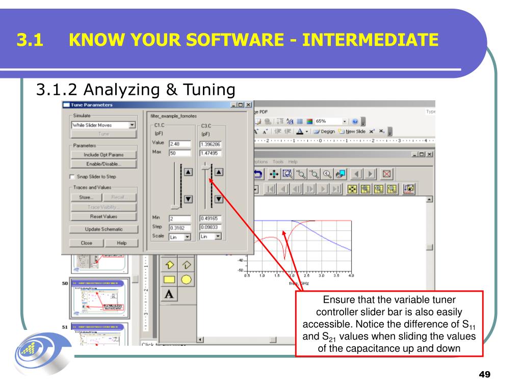 3.1 KNOW YOUR SOFTWARE - INTERMEDIATE 3.1.2 Analyzing & Tuning Ensure that the variable tuner controller slider bar is also easily accessible. Notice the difference of S11 and S21 values when sliding the values of the capacitance up and down