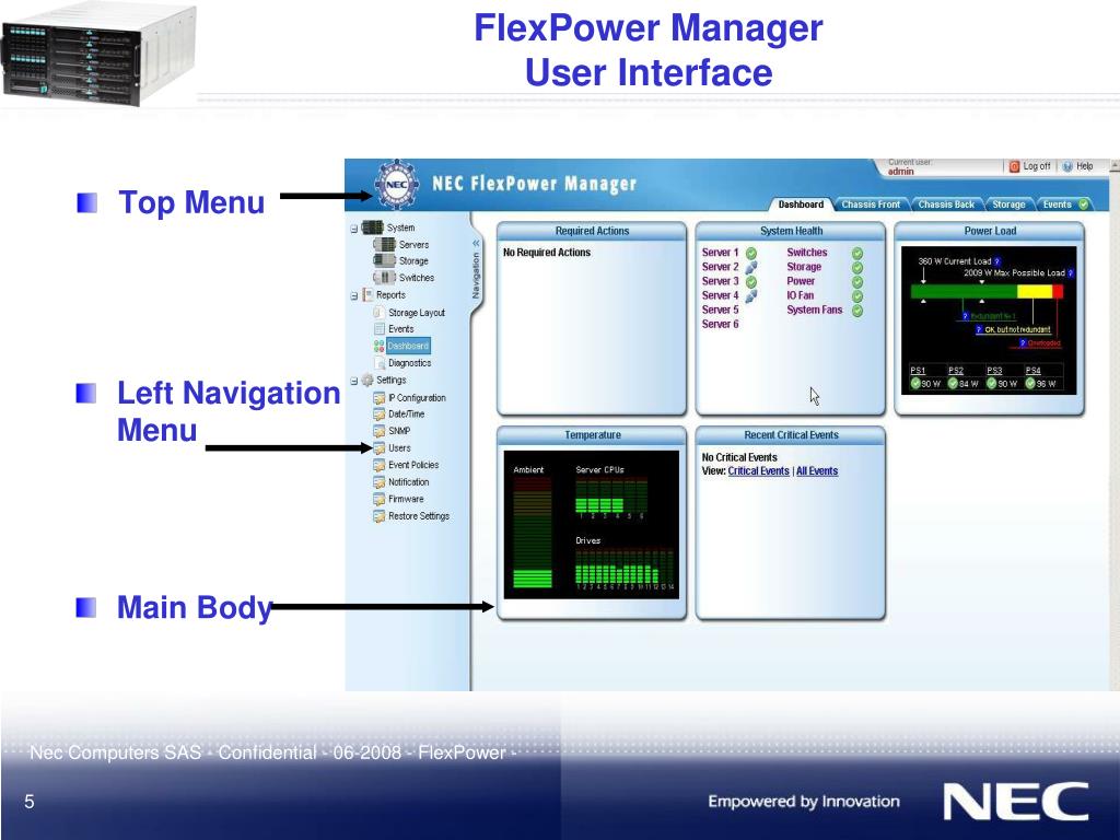 FlexPower Manager User Interface • Top Menu • Left Navigation Menu • Main Body Nec Computers SAS - Confidential - 06-2008 - FlexPower -