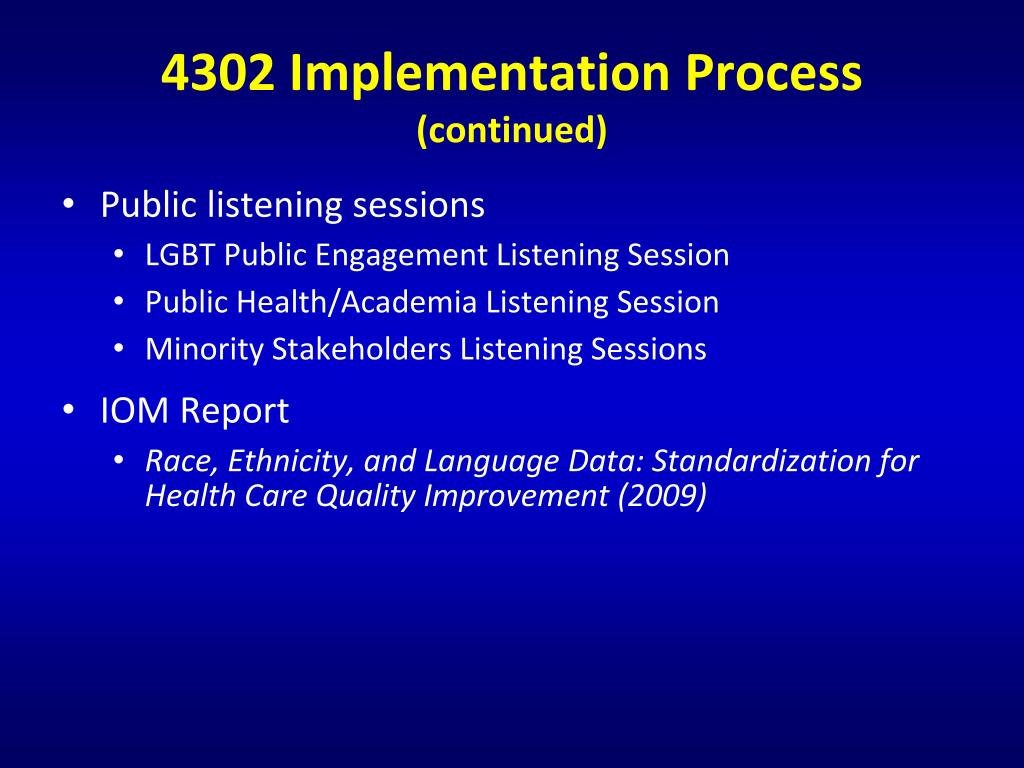 4302 Implementation Process (continued) • Public listening sessions • LGBT Public Engagement Listening Session • Public Health/Academia Listening Session • Minority Stakeholders Listening Sessions • IOM Report • Race, Ethnicity, and Language Data: Standardization for Health Care Quality Improvement (2009)