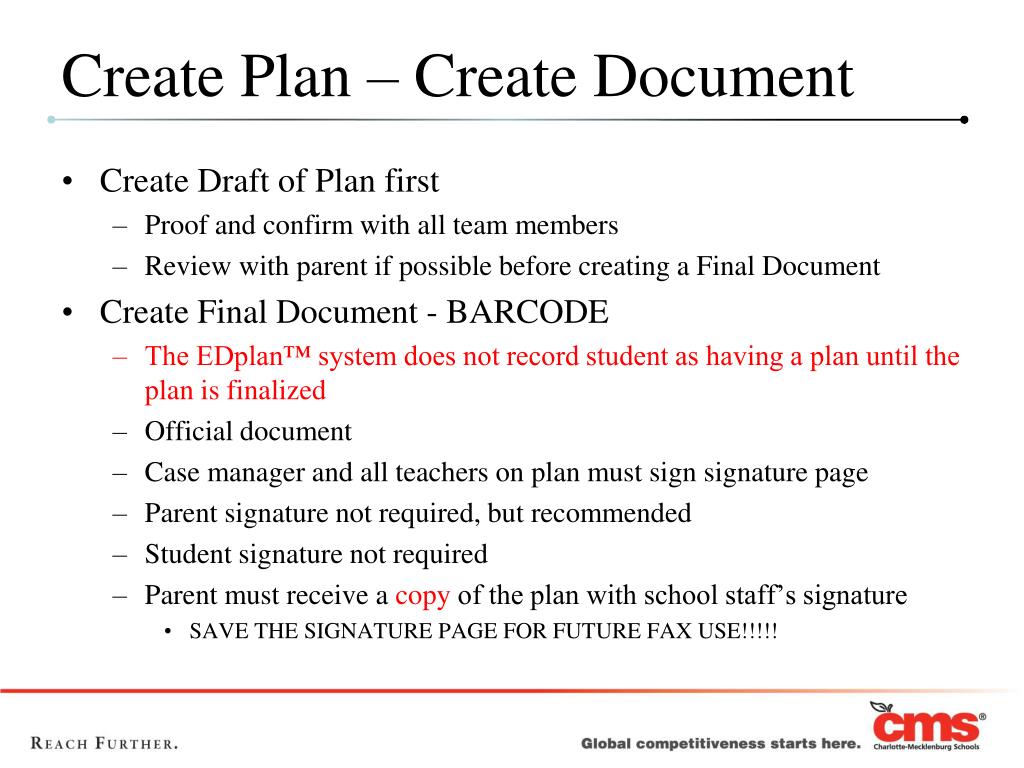Create Plan – Create Document • Create Draft of Plan first • Proof and confirm with all team members • Review with parent if possible before creating a Final Document • Create Final Document - BARCODE • The EDplan™ system does not record student as having a plan until the plan is finalized • Official document • Case manager and all teachers on plan must sign signature page • Parent signature not required, but recommended • Student signature not required • Parent must receive a copy of the plan with school staff’s signature • SAVE THE SIGNATURE PAGE FOR FUTURE FAX USE!!!!!