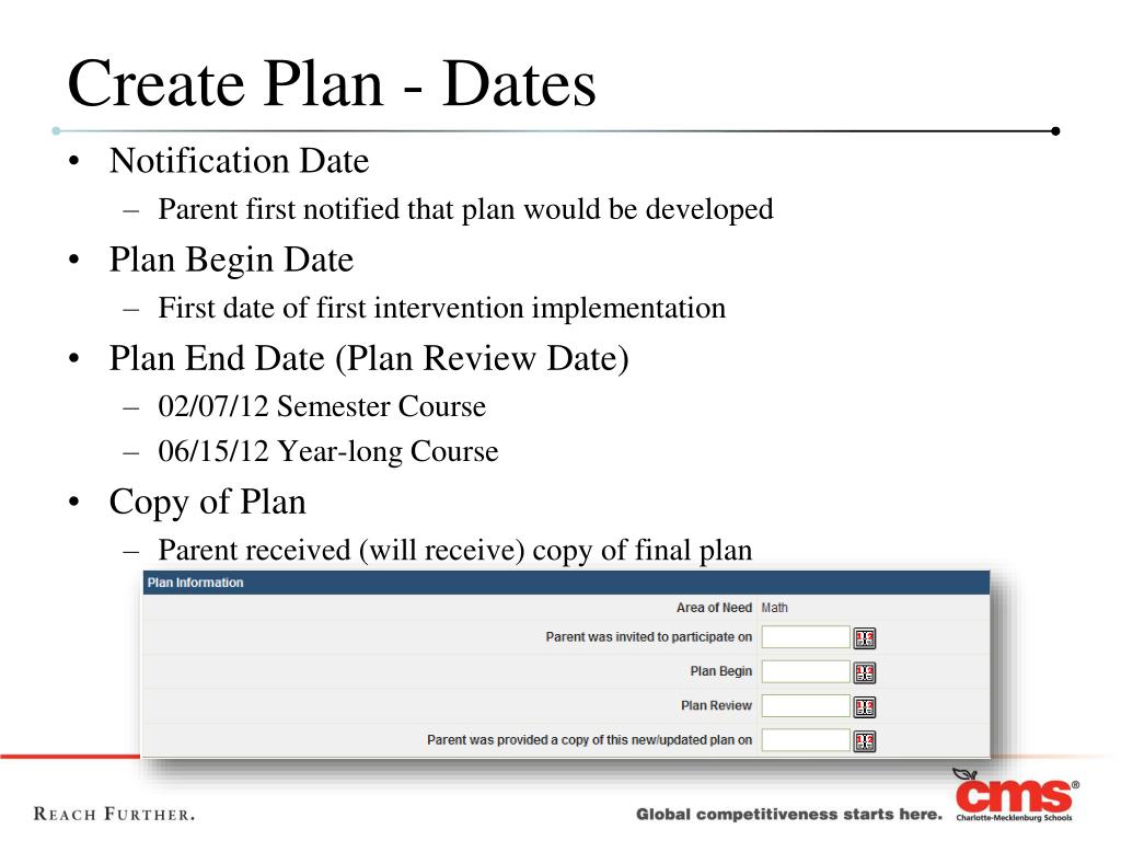 Create Plan - Dates • Notification Date • Parent first notified that plan would be developed • Plan Begin Date • First date of first intervention implementation • Plan End Date (Plan Review Date) • 02/07/12 Semester Course • 06/15/12 Year-long Course • Copy of Plan • Parent received (will receive) copy of final plan
