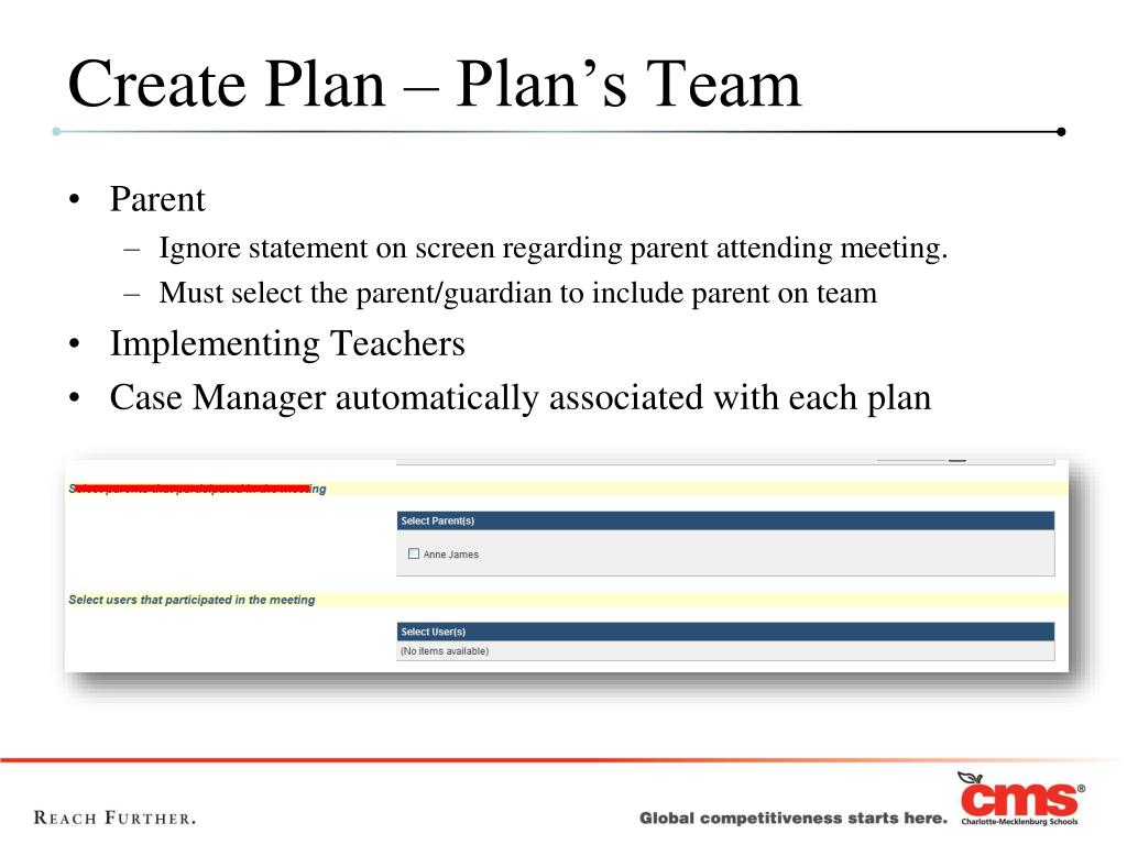 Create Plan – Plan’s Team • Parent • Ignore statement on screen regarding parent attending meeting. • Must select the parent/guardian to include parent on team • Implementing Teachers • Case Manager automatically associated with each plan