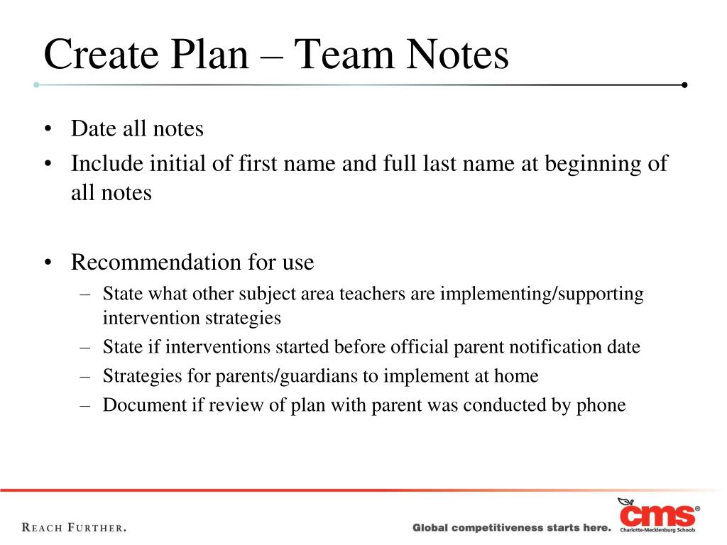 Create Plan – Team Notes • Date all notes • Include initial of first name and full last name at beginning of all notes • Recommendation for use • State what other subject area teachers are implementing/supporting intervention strategies • State if interventions started before official parent notification date • Strategies for parents/guardians to implement at home • Document if review of plan with parent was conducted by phone