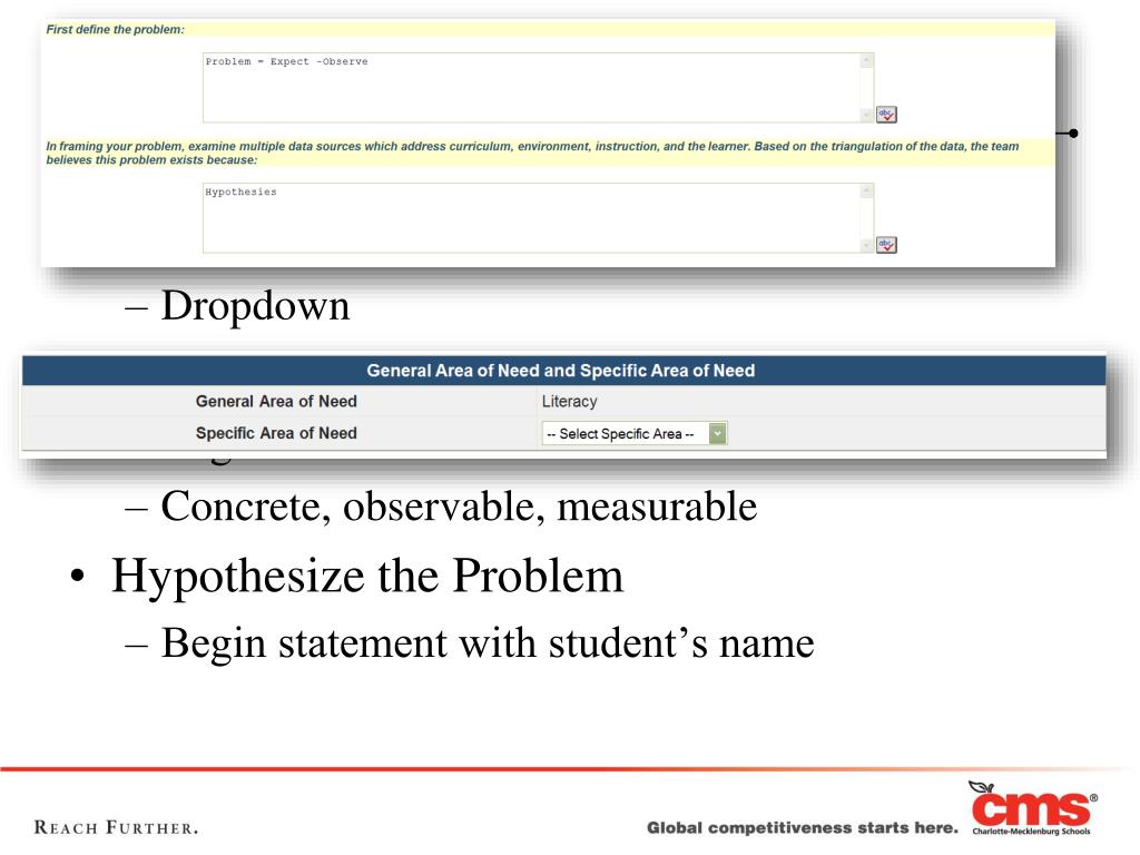 Define & Hypothesize • Confirm Specific Area of Need • Dropdown • Define the Problem • Begin statement with student’s name • Concrete, observable, measurable • Hypothesize the Problem • Begin statement with student’s name