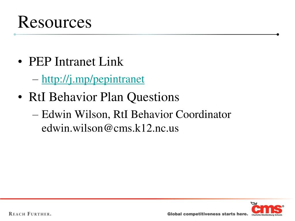 PEP Intranet Link http://j.mp/pepintranet RtI Behavior Plan Questions Edwin Wilson, RtI Behavior Coordinatoredwin.wilson@cms.k12.nc.us Resources