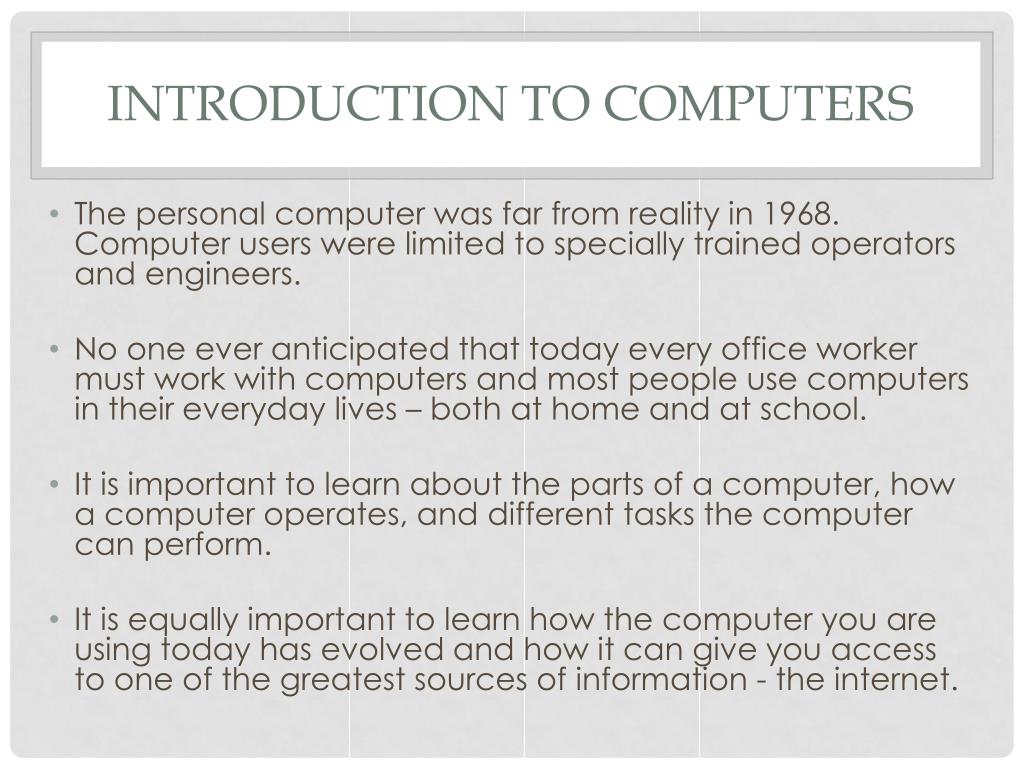 Introduction to Computers • The personal computer was far from reality in 1968. Computer users were limited to specially trained operators and engineers. • No one ever anticipated that today every office worker must work with computers and most people use computers in their everyday lives – both at home and at school. • It is important to learn about the parts of a computer, how a computer operates, and different tasks the computer can perform. • It is equally important to learn how the computer you are using today has evolved and how it can give you access to one of the greatest sources of information - the internet.